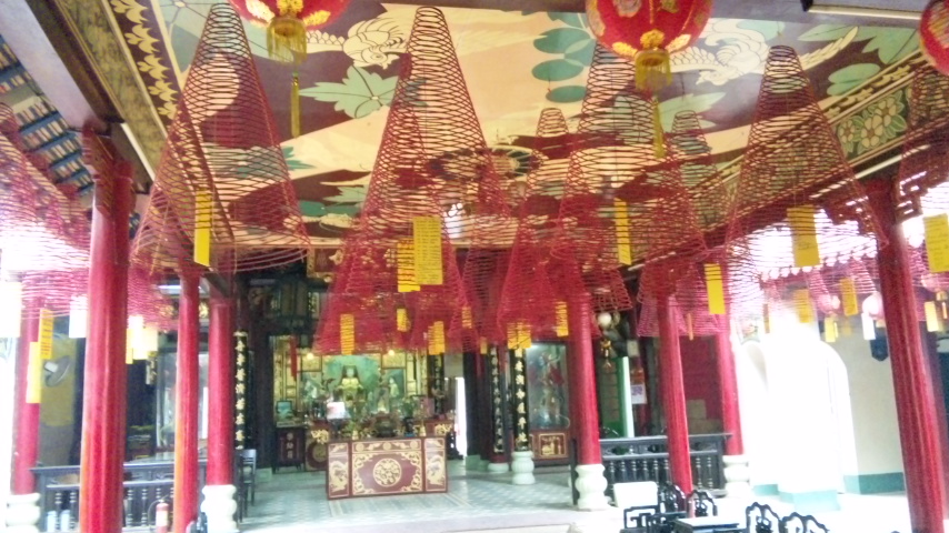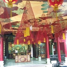 内部はよく見る天井からのぐるぐる巻きの線香がたくさんあり、