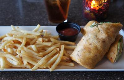 私は、バッファローチキンのラップ、主人は、アルバーター牛のステーキサンドをオーダー。あまり期待はしていなかったのですが、意外にもピリ辛のチキンとレタス、チーズなどが巻かれていて、おいしいのにビックリ!主人のステーキサンドも、ちょっと焼きすぎ気味ではあるものの、臭みもなく美味だったとか。添えられたほうれん草のサラダがかなり美味しかったので、横からぱくぱく食べちゃいました。