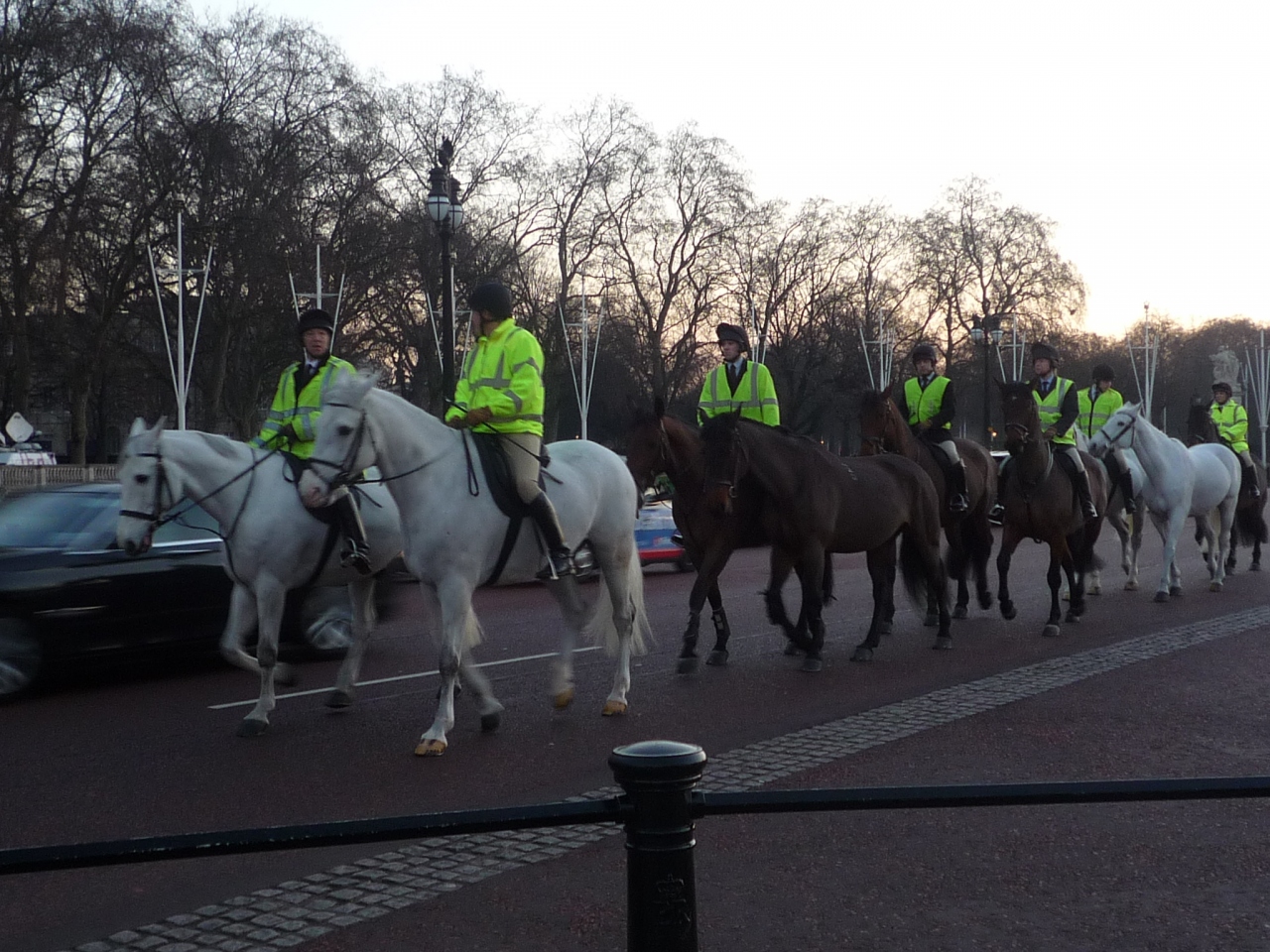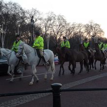 バッキンガム宮殿(Buckingham Palace)の朝、写真の様に警備隊が馬に乗ってバッキンガム宮殿を守ってます。朝7時過ぎの光景です。馬が路上を歩き、その端を車が通過する様子が見れます。ぜひ、一度、朝早く行ってみては