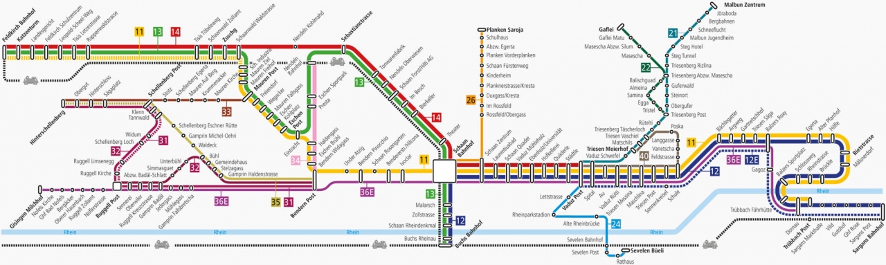 オーストリア国鉄が、リヒテンシュタイン国内を運行していますが、レイルジェットは全てリヒテンシュタイン国内を素通りしてしまい、朝夕の通勤列車のみが通常の運行ですので、このバスを利用するのが最も賢明です。