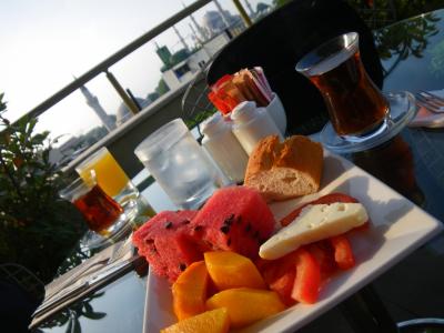 TANホテルの朝食は、屋上にあるテラスでいただきます。hpでここからの眺めを見て、このホテルにしたといっても過言ではありません。テラスのベスポジを確保すると、正面にブルーモスクがど~んと!ちょっと周りのビルも目に入るものの、いい眺めです。暑さにやられ気味だった私の朝ごはんは、ほぼフルーツとトマトのみ...。搾りたてのオレンジジュースやオムレツは、その都度スタッフに頼めば持ってきてくれます!