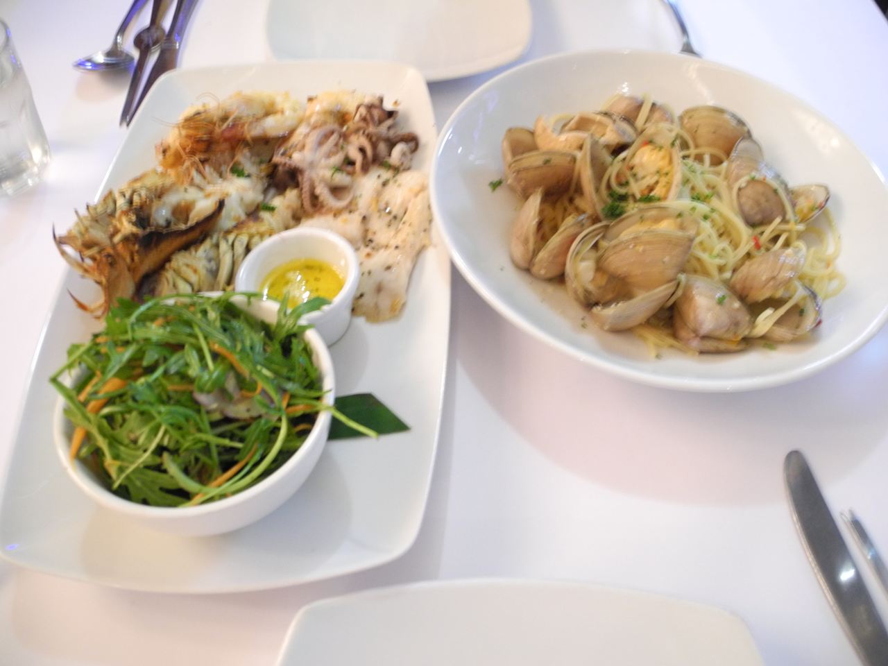 プラッターはちょっとお高いのでパス。エビ、タコやバラマンディという魚のMixed Seafood Grill、ボンゴレのスパゲティと生ガキを注文。Mixed Seafood Grillよりもボンゴレのスパゲッティのほうが、アサリがいっぱいでおススメかも。全部で70ドルくらい。18:30までに注文すれば15%オフみたいで、かなりお得です。