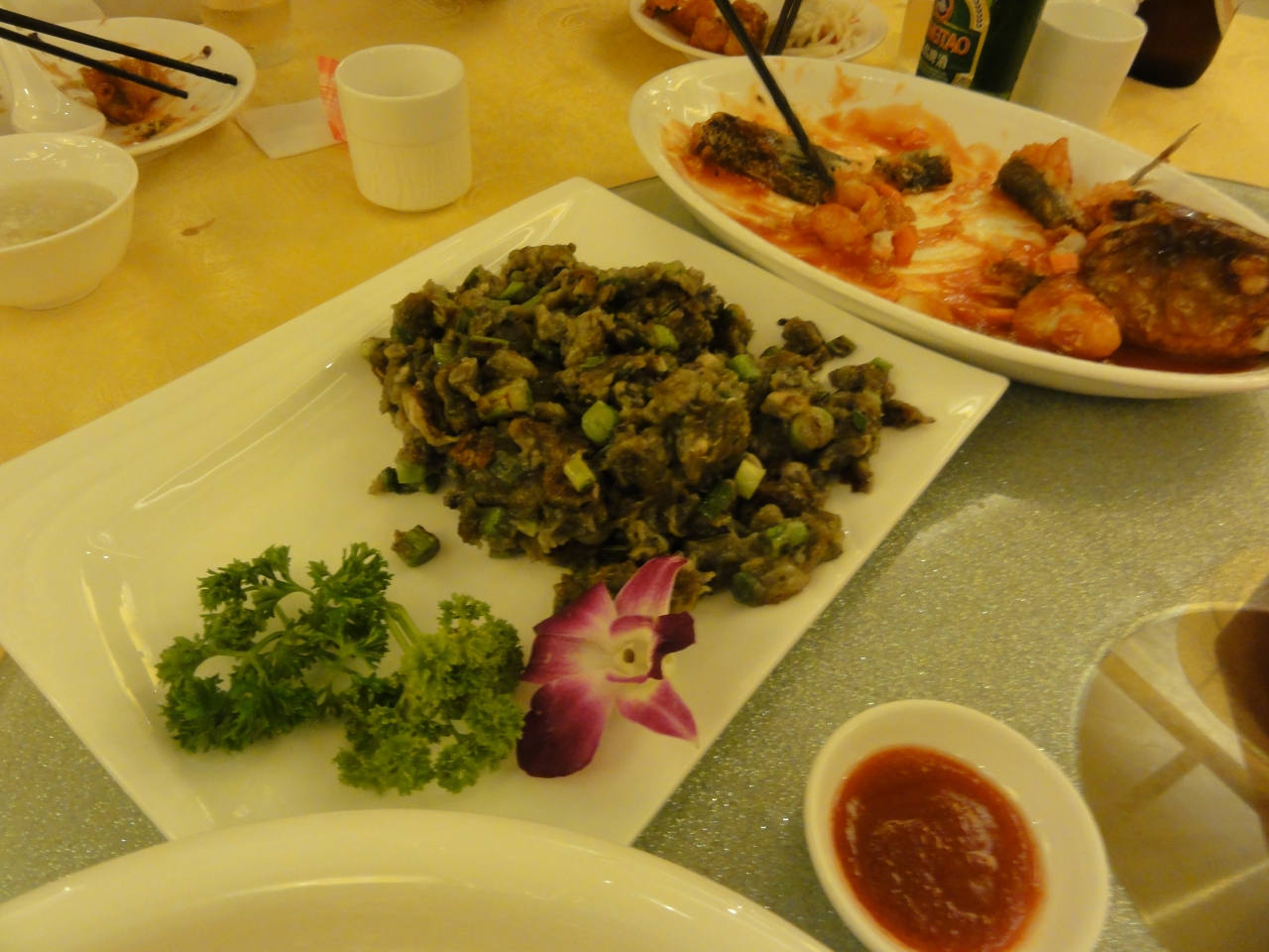 コロンス島で見かけたパイ風の皮で包んだもの、厦門風の生春巻き、タロイモの蒸し物、中味は小龍籠のようなパンの揚げ物、青菜の炒め物、焼きビーフン、蟹入りのお粥、きのこのスープ、牡蠣の炒め物、揚げ魚、蛸の麺、西瓜のデザートでした。揚げ魚、お粥、青菜の炒め物、ビーフン以外は初めて食べた料理でした。お店の名物は蛸のすり身を麺状にしてセロリと炒めたもので、プリプリした食感で美味しかったです。牡蠣の炒め物はどうしたらこんな色になるのか?独特の料理でした。