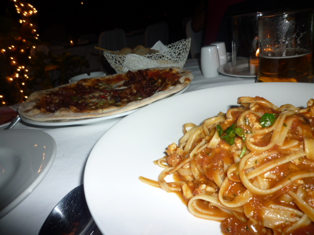 肝心のお料理は日本人の私たちには一皿の量が多く、相方もんちゃんとシェアして、イタリアンサラダ、ロブスターがゴロゴロ入ったパスタや薄皮ぱりぱりのピザ、カクテルを注文しても二人で日本円で2000円ちょっとだったかと思います。安い~グッ!! ( ̄ε ̄〃)b