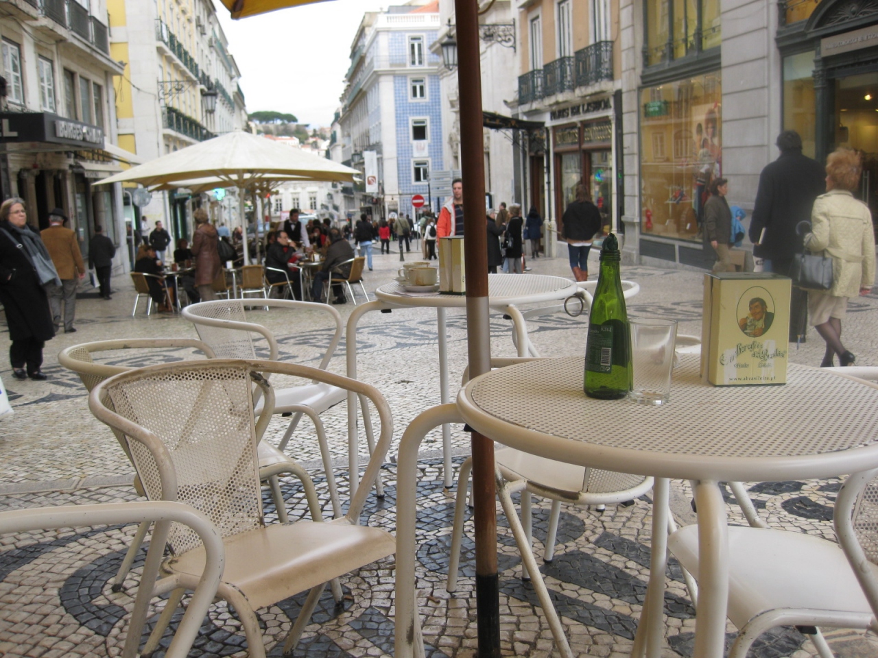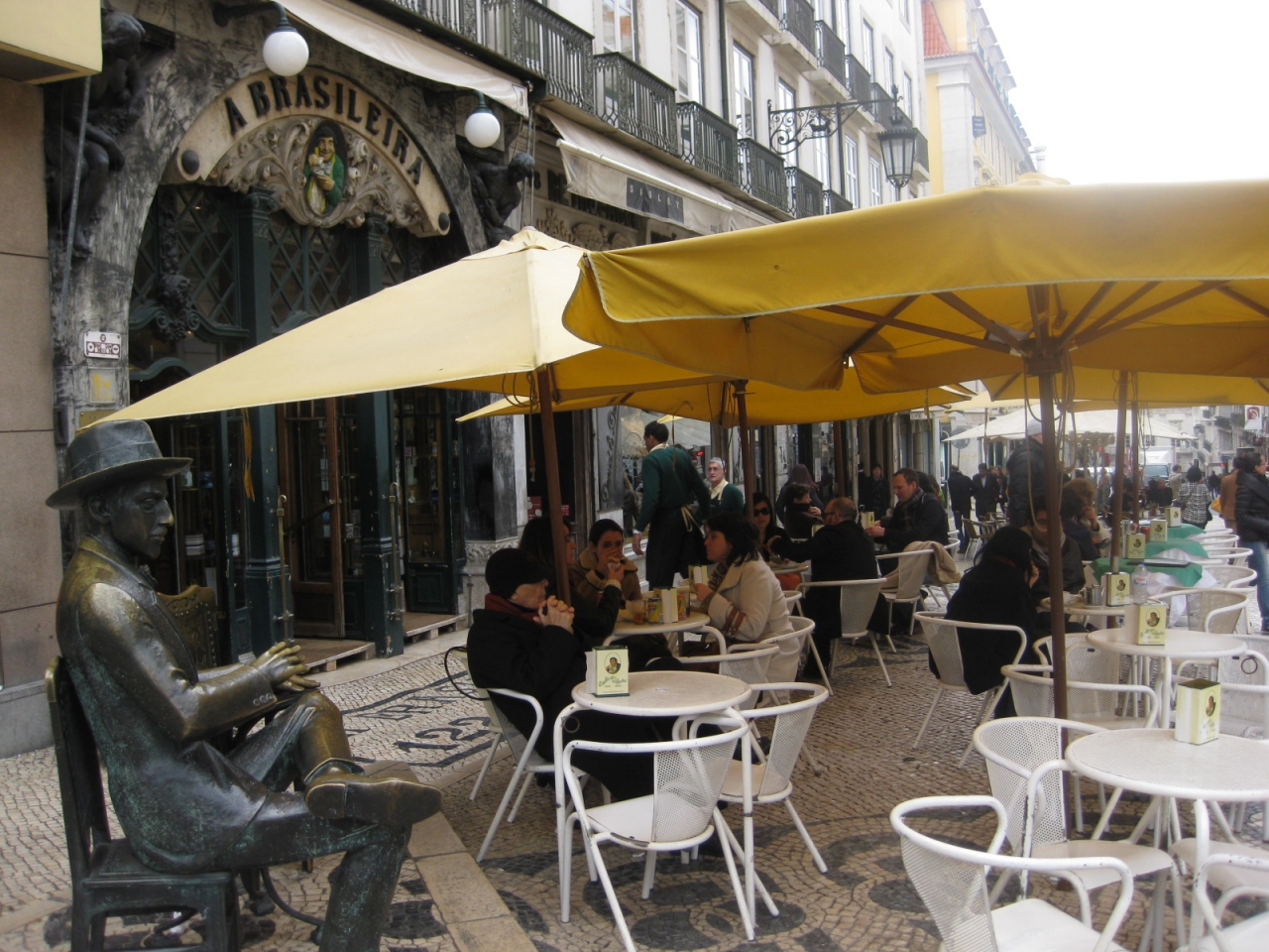 店先のベンチに、かつての常連客の詩人ペソアの銅像があります。