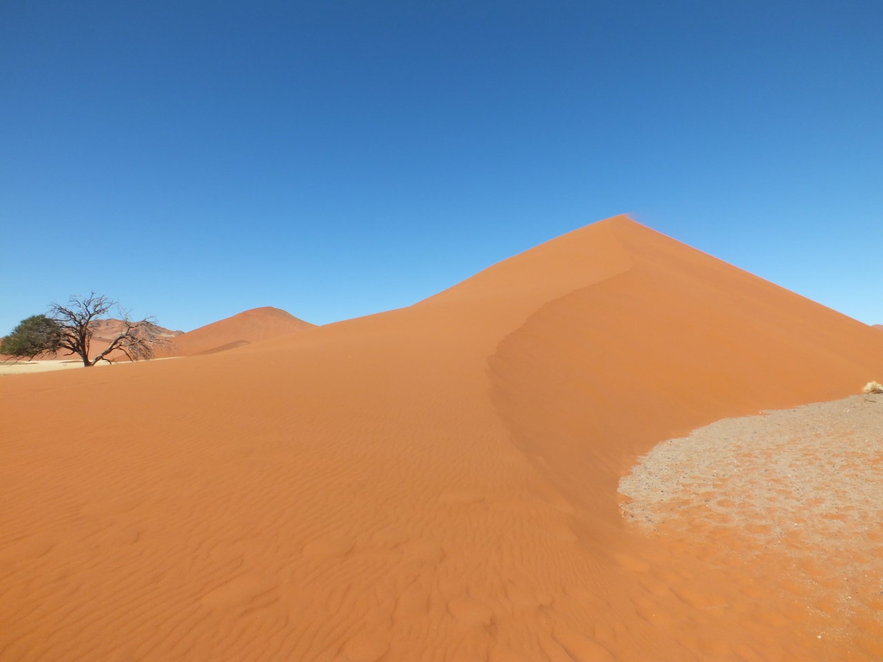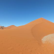 ナミブ砂漠でも深部にあるセスリウムにある砂丘です。国立公園のゲート前には開門前に長い車の列ができます。日の出とともに見るには中に泊まる事をお勧めします。開門からまもなく入場しました。dune45に着いた時はバスも止まり、人も結構多かったので、さらに奥のソッサスフレイに先に行き砂丘に登りました。お昼頃戻っので影はありませんでしたが、美し形を楽しみました。