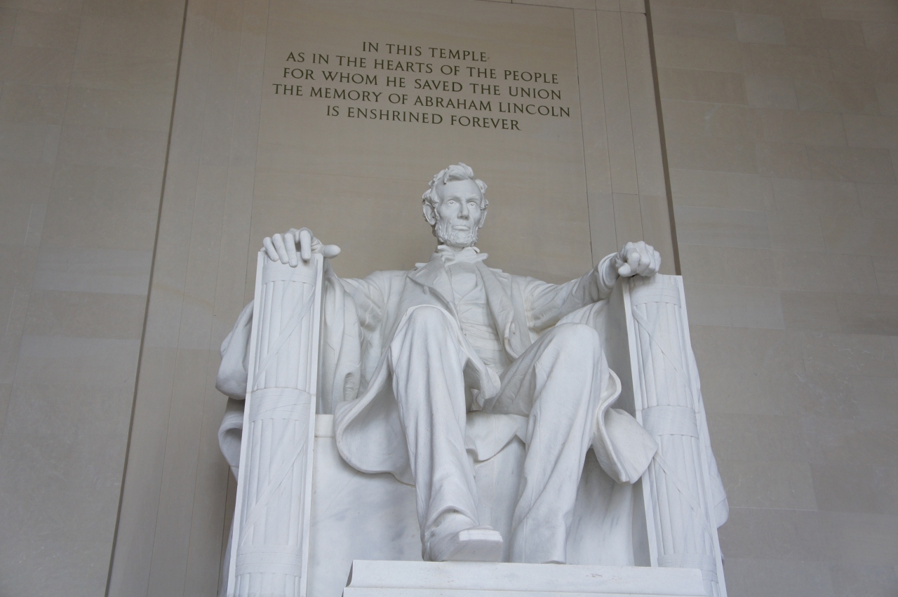 自由と平等の象徴として、ワシントンD.Cの定番の観光スポットですから、観光客で賑わっています。リンカーンが凝視している先には国会議事堂があり、前には大きなプールがあります。リンカーンの像と記念堂の辺りは、数多くのアメリカ映画に出てきますね。