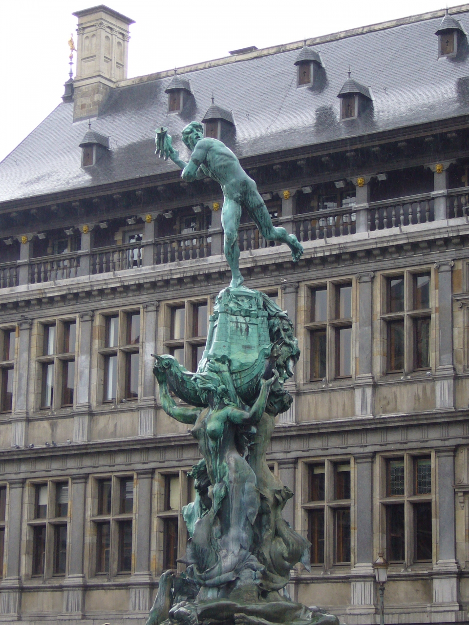 マルクト広場には面白い像がある。手を投げる格好をした像が建っている。これはブラボー伝説に由来している。ローマ兵士ブラボーが、スヘル川で猛威をふるっていた巨人を倒し、その手を切り取って川に投げ、町の名はこれにちなむという。