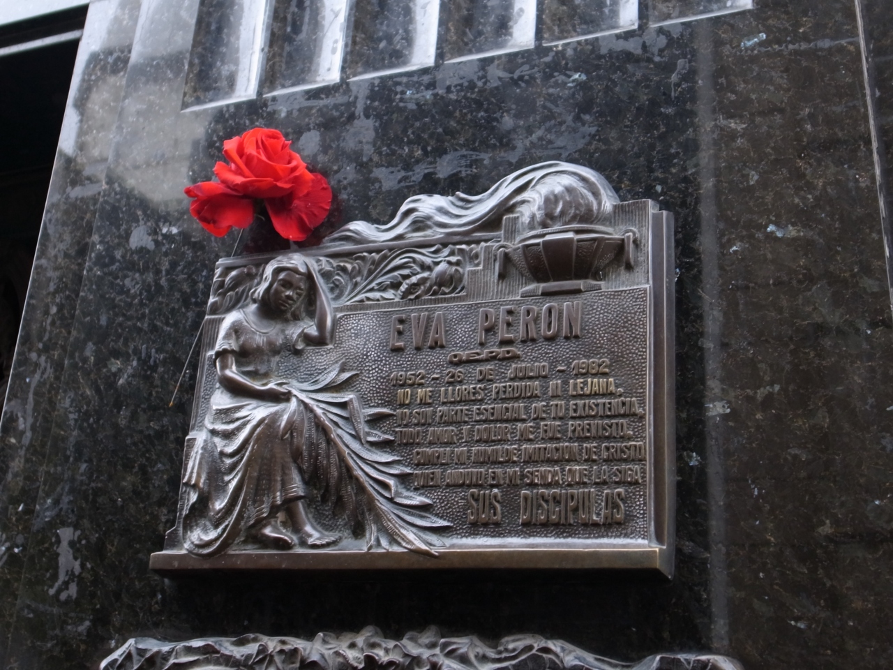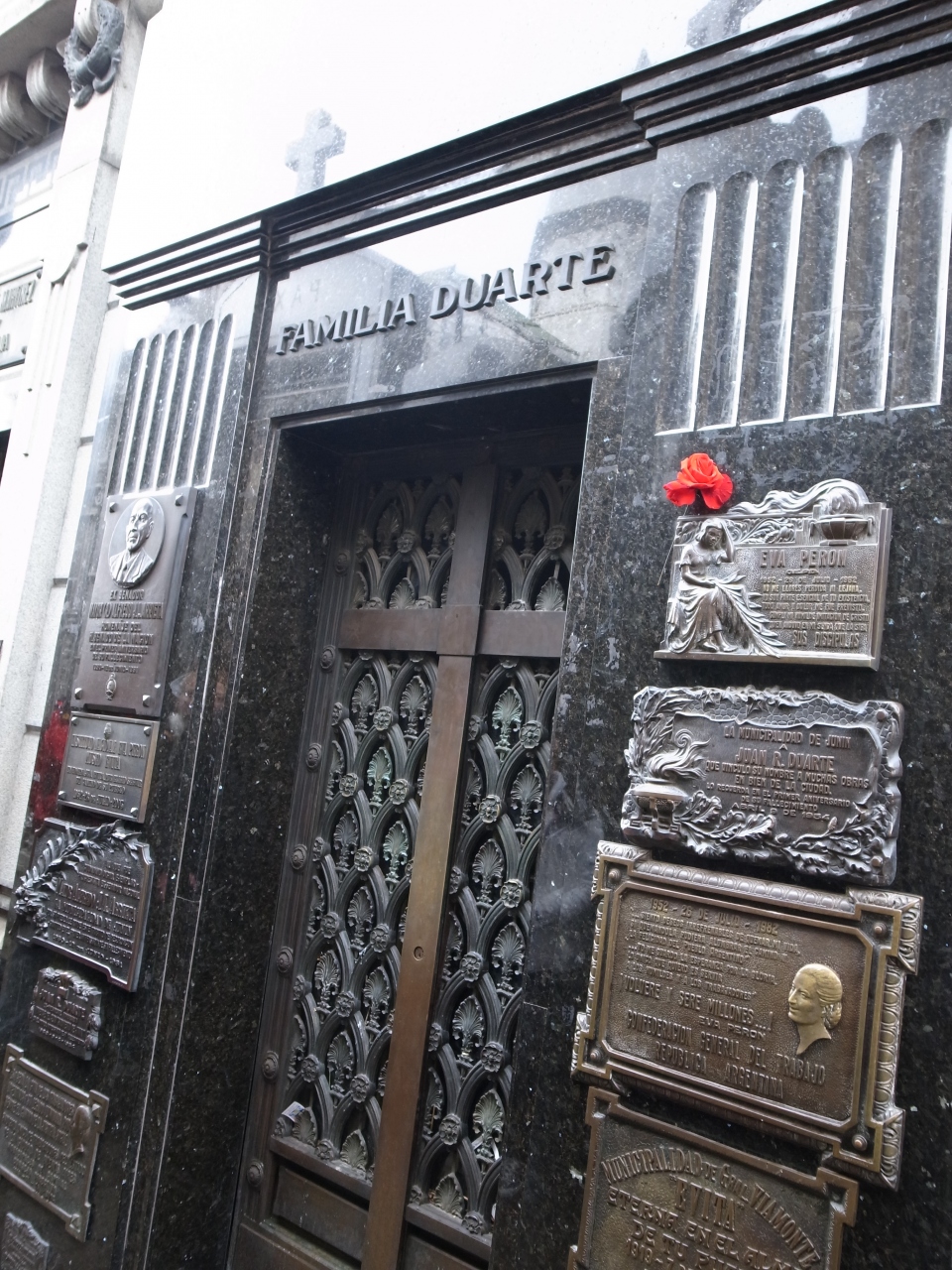 レコレータ墓地の中では、多分世界的に最も有名な墓だと思います。その割には特に目立つ場所にあるわけでもなく、他の墓(厳密に言えば納骨堂)と同じような感じなので、行き当たりばったりで行くと何処に何があるのか解らず、道に迷ってしまいます。できれば地図を用意するのがいいですが、運が良ければツアーに出会え、それについていくのもいいと思います。エビータファンなら、やはり必見かな。