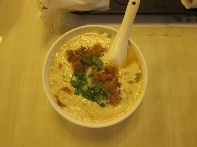 私たちは鹹豆漿+油條と厚焼餅加蛋を注文しました。主人は豆漿と聞いて、日本で飲むような豆乳を想像し、最初は「オレは味見程度でいい」と言っていましたが、実際は鹹豆漿は小エビが入ったあっさり茶碗蒸しのような味で、油條を加えることによりコクが出てかなり美味で、主人も一人で1杯をペロリと平らげていました。厚焼餅加蛋はもちもちで期待通りの美味しさでした。