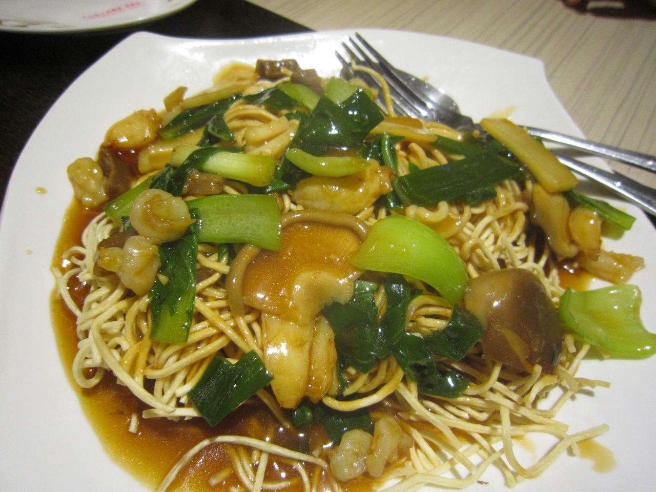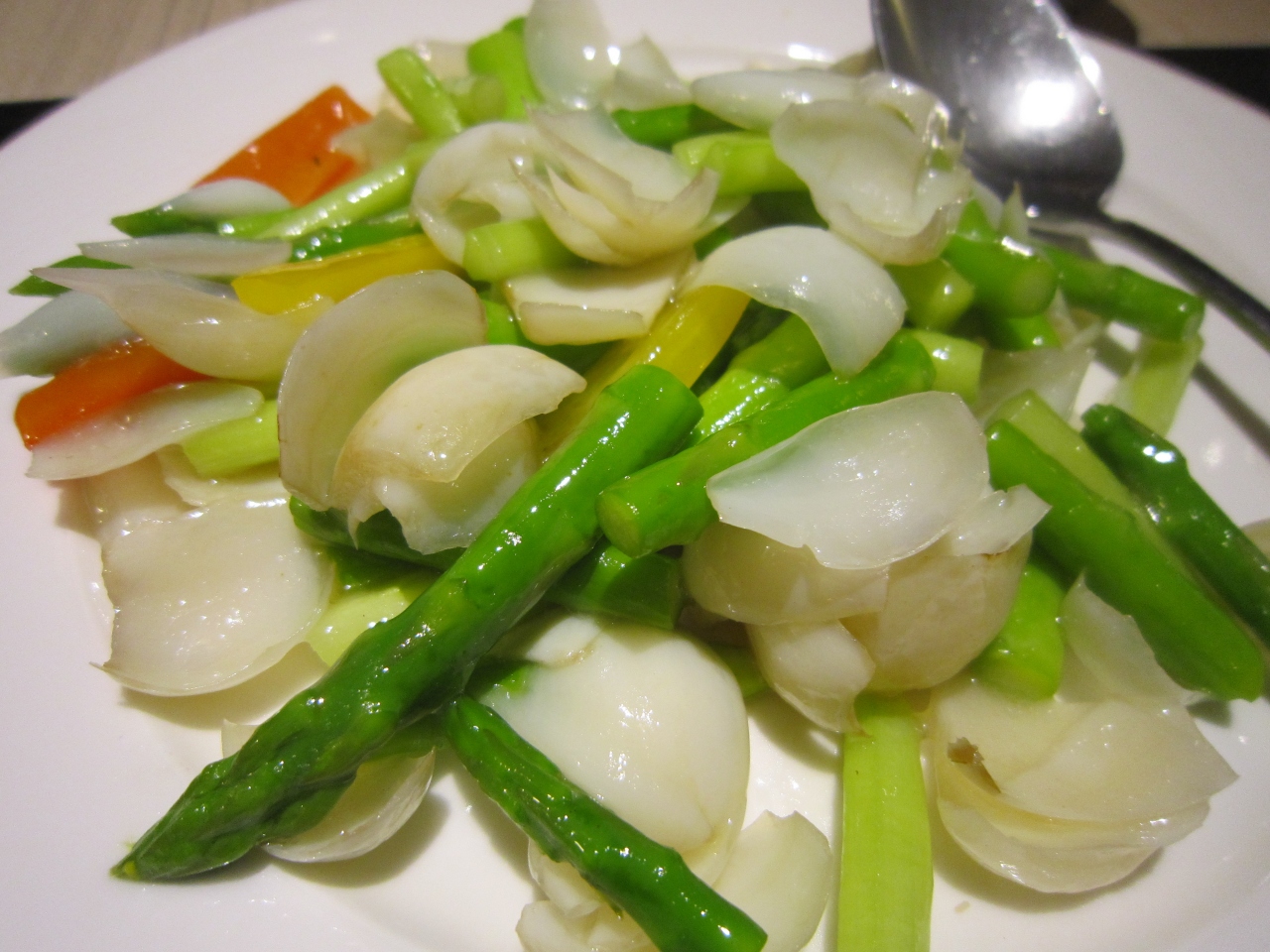今回は、かた焼きそばらしきものと、アスパラと百合根の炒め物を注文しました。