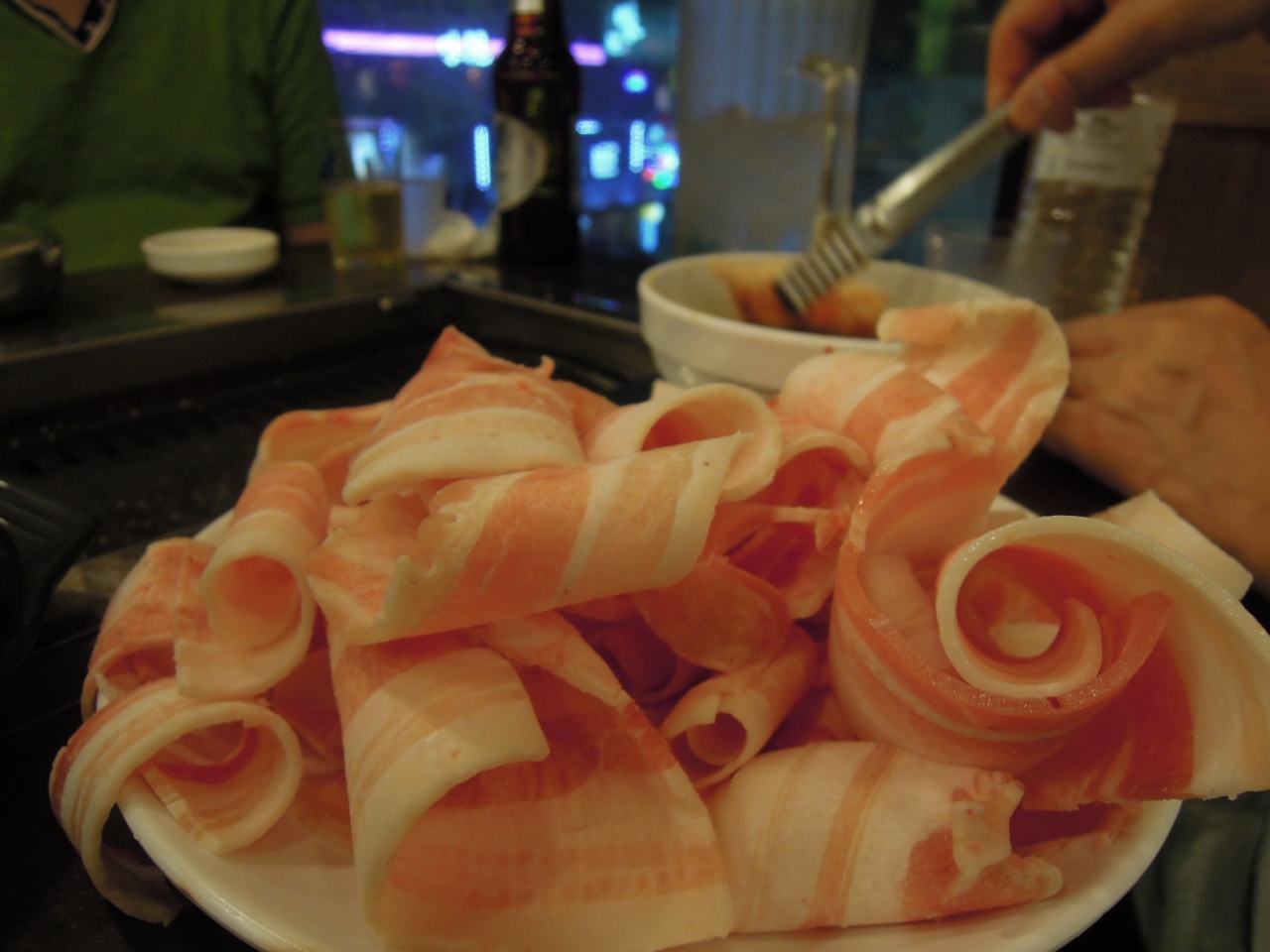 予約は受け付けていないということで、日曜日夜8時頃20分くらい並んで入店。どうみても通常2人席のところに4人押し込まれた感じで、テーブルの上に惣菜類と色彩豊かな野菜類がところ狭しと並びます。コレ、食べれるのかな?と思うような不思議な青い葉っぱにくるんとカールした肉を包みながら、ぱくぱく底なしでおなかの中に入っちゃいました。とてもおいしかったです。