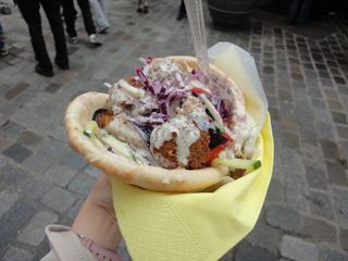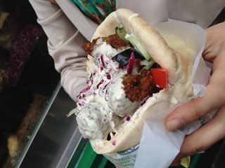 ひよこ豆のコロッケと野菜がたっぷりピタパンにはさまれています。