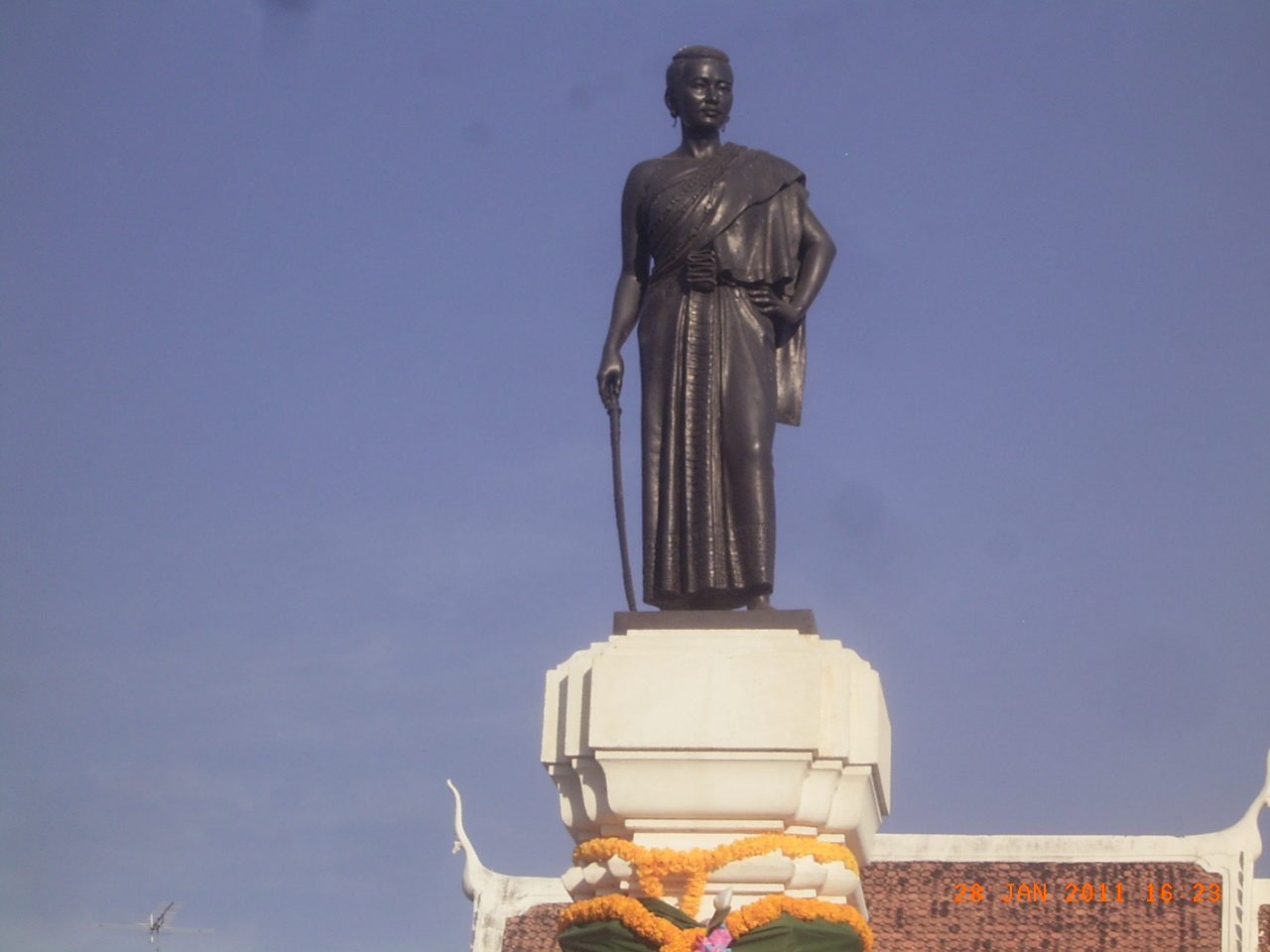 この像は西門にあたるチュムポン門を出たところにあります。この門より西が新市街地です。門からは旧市街地です。堀と土塁で囲まれています。今も門と土塁や城壁の一部が残っています。この像の夫人は、ラオス軍が侵入してきたときに、機転でこの街を救った人です。