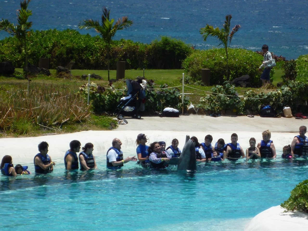 オプショナルツアーでドルフィン・エンカウンター(110ドル)を申し込みました。20人くらいで1グループとなって、一人ずつイルカとタッチしたり、キスをしたりします。全体の時間としては1時間くらいあったのかもしれませんが、人数が多いせいかあっという間に終わってしまいました。もっとイルカとふれあえるものと期待していたので、少し物足りなさを感じました。施設の人がイルカとキスしている写真を撮って販売してくれるのですが、値段が高くて買えませんでした。記念の1枚が手元に残らなかったのが残念。