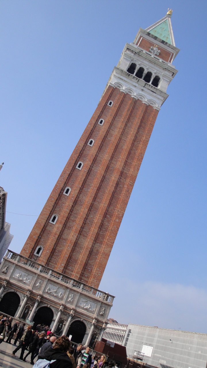高さ102mの鐘楼へは、有料ですがエレベータで上がれます。上からの眺めは、ベネチアの島々、家のレンガ色の屋根瓦など、他では見ることのできないパノラマが広がります。エレベータの混み具合は、時間帯によります。長蛇の列の時もあれば、すぐに乗れる時も…ベネチアは教会もたくさんあって、いつもどこからか教会の鐘の音が響いていて心癒される町です。