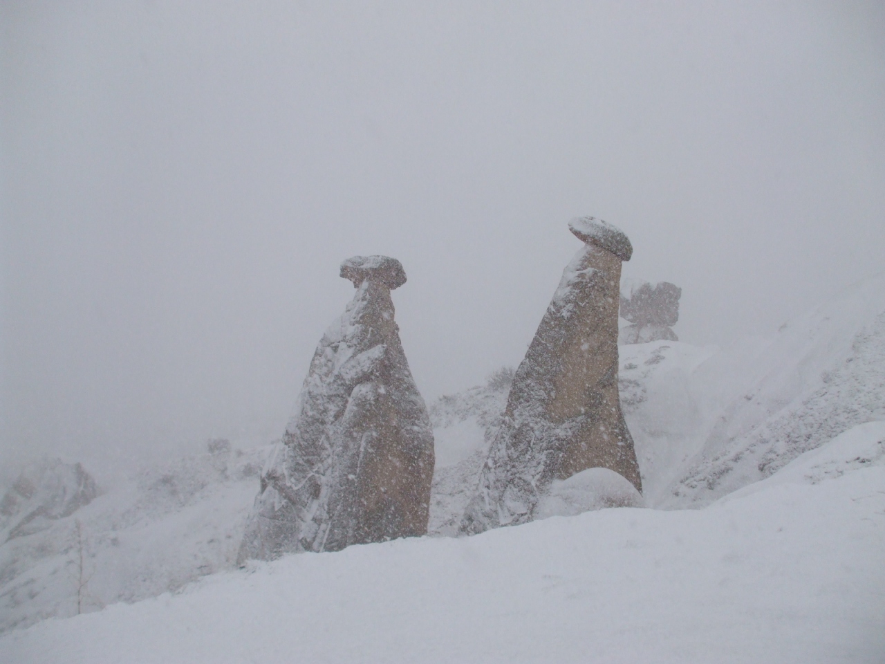 訪問した日がなんと大雪、というか吹雪の日でした。視界もほとんどなく、あきらめていたのですが、うっすらと奇岩が現れてくれて、感動もひとしおでした。駐車場からスリーシス