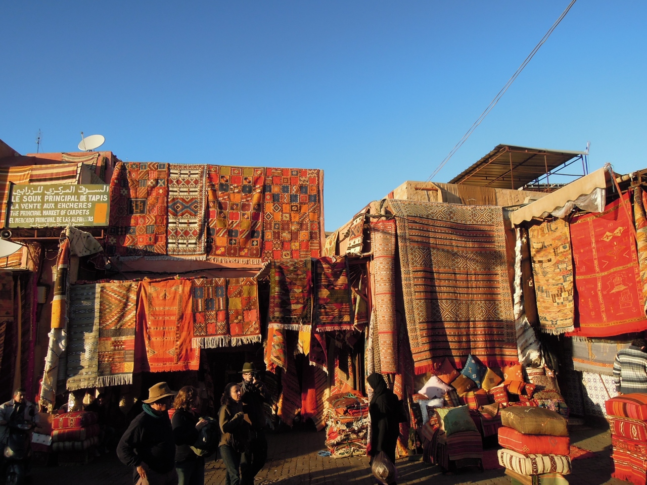 フナ広場から10分くらい歩いたところだったかな。狭いスークを抜けるとラグを売ってる広場があります。夕方の光景がすばらしいです。夕焼けにそまったラグがすべてオレンジ色になり統一感がでます。この周囲には一休みできるカフェが多いので、上にあがってミント茶でもいかがでしょう?