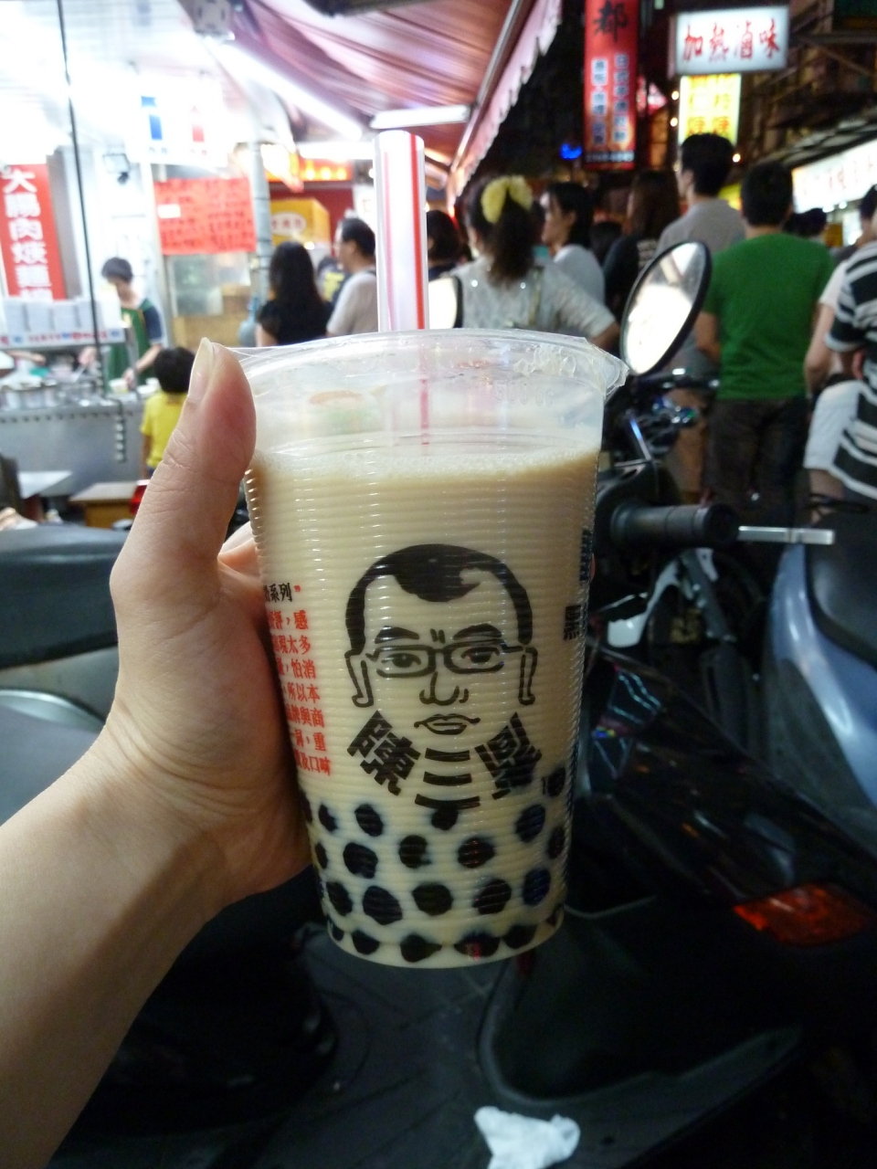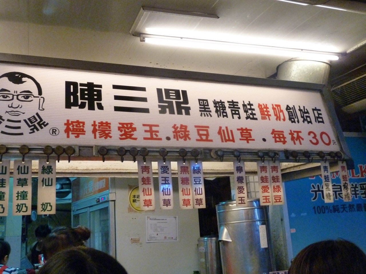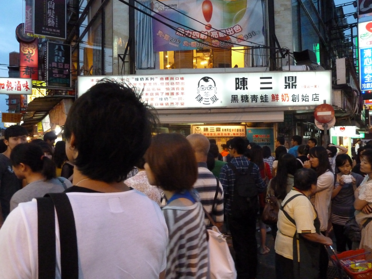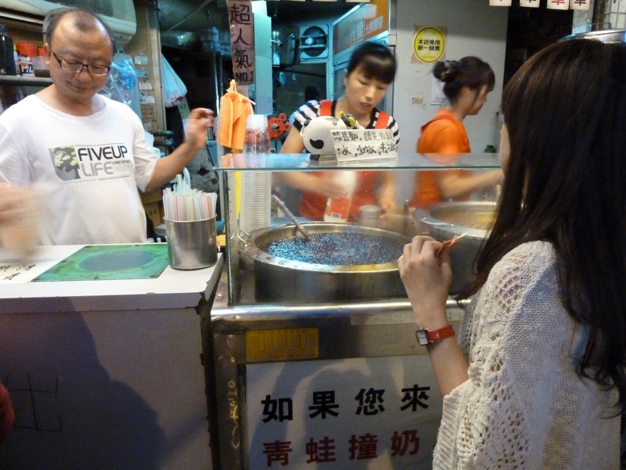 公館夜市でとても有名なお店ということで行ってみたらお店の前にすごい人だかりがしており、よく見るとらせん状に行列ができていました。長い長い列に並んで10分ちょっとくらいで順番が回ってきます。一番有名だという青蛙撞奶という、黒糖で煮たブラックタピオカと牛乳を合わせたドリンクを頼む。氷の量は自分で申告するようです。タピオカは粒が大きくて黒糖の味が濃く、かなり柔らかくなるまで煮込んであります。牛乳と合わせるととってもおいしいです、でもこれだけでおなかがかなりいっぱいになります。ものすごく人気があるのに、一杯30ドルでした。安い!