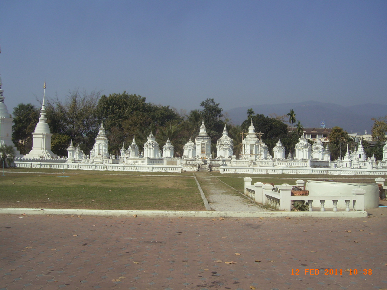 城壁の外にあります。スワン・ドーク門である西門から西に15分程度かかります。この寺は14世紀に王宮の庭に建てられました。ここにはラーンナー王朝の歴代の王や王族の仏塔があります。白い仏塔です。装飾が色々です。