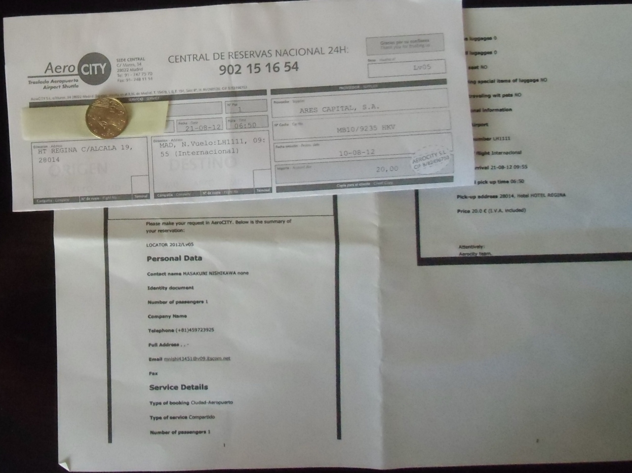 朝早めに空港に着きたかったので、マドリード市内のホテルからマドリード空港までAero CITYの送迎タクシーを利用しました。事前にインターネットで日時を予約し、確認書を持って行けば、利用できます。予約時にクレジットカード番号を入力しますが、これは担保で、支払は現地で現金かクレジットを選択できます。値段も事前にわかっているので安心ですし、通常のタクシーを利用するより安いと思いました。タクシーと言ってもワンボックスのワゴン車なので、広くて快適でした。早朝や夜遅くに移動する場合はお勧めです。