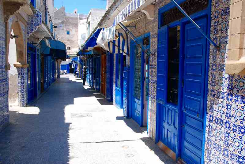 何でも青い色に塗られている! この町に着いて、なんとなく気が付いたが、旧市街に入ってみて、その感を深くした。細い街路が入り組んでいるのは、モロッコなら、どのメディナに入ってみても共通しているが、ここは、各戸の入り口、外壁のすべてが青いのであった。同じ美しい色調の青なので、いっそう感動した。