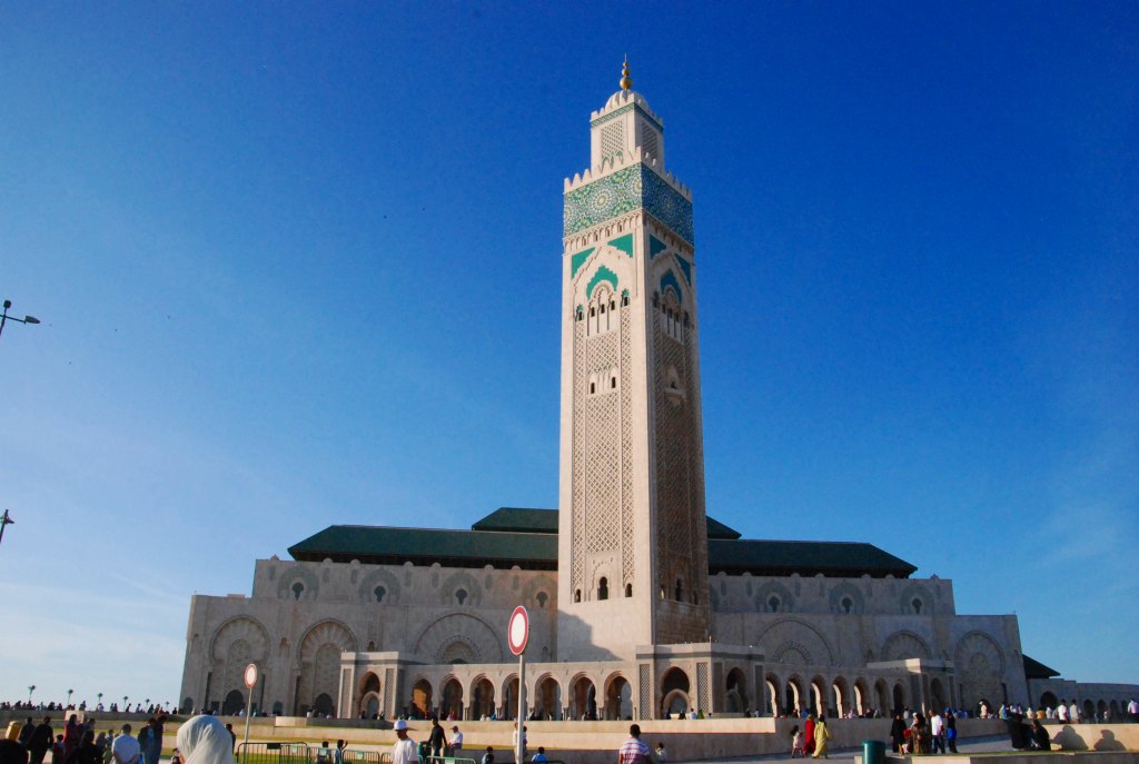 モロッコを訪ねて、どこに行っても感じていたのは、空がきれいなこと。とくに空の青さが心に残る。このモスクでもそうだった。東洋の異教徒に意味は分からないが、大きな建物のモスクの前にそびえる高い塔。タイルで幾何学的な模様が描かれ、上部は緑。こうした構図のすべてが、背景にある空の青さにマッチしている。宗教もひとつの威光だとすれば、このモスクは自然をきわめてうまく利用して、その存在感を出していると思えた。