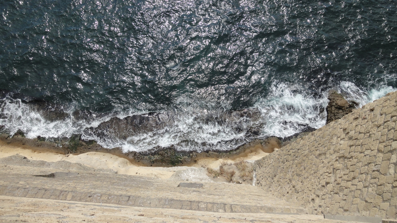 厳つい風貌の卵城と真っ青な海とのコントラスト、海に浮かぶ巨艦のごとくたたずむ姿、そんな感じが面白いと思いました。