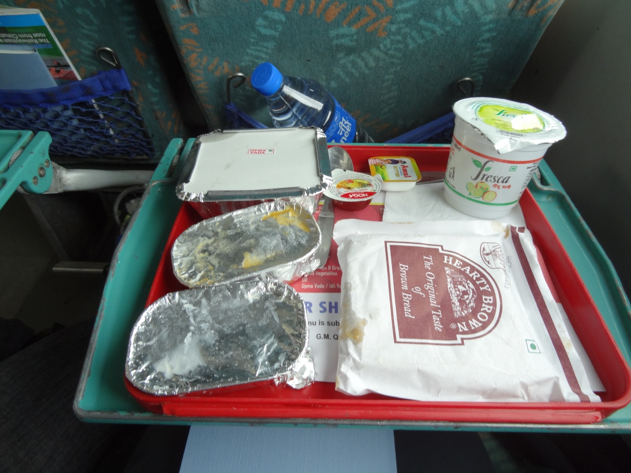 車両は古めで、座席も少しボロボロな状態でしたが、1リットル入りの水と食事が出ました。客層は外国人とインド人が半々ほどでした。