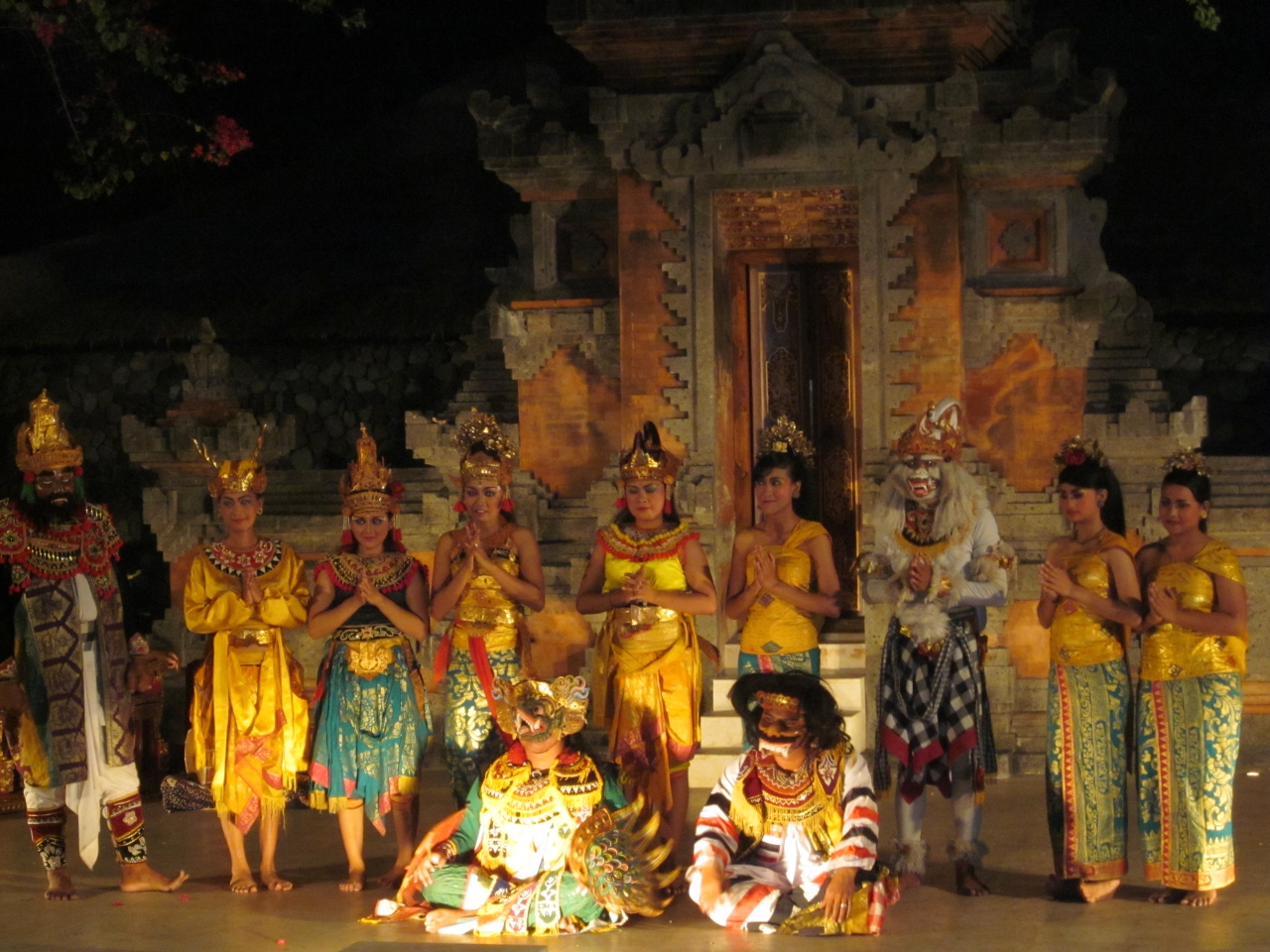 星空の下で、日替わりのバリ舞踊を楽しみながらのブッフェディナー。以前はロブスターBBQもありましたが、今回は海老と蟹でした。あちらこちらに点在する屋台やブースで、ミーゴレンやサテなどインドネシア料理を中心としたお料理が楽しめます。バリでは、温かいものを温かく提供する文化がないらしく、あちこちで冷めた料理を食べさせられましたが、こちらでは、えびせんべいさえ揚げたてで感動しました。会場の外には、お土産売りの屋台が並び、ちょっとしたナイトマーケットの雰囲気。街のレストランより割高ですが、お子様連れにも安心です。会場は段々になっているため、どのテーブルからもショーがよく見えます。ショーの後、舞台でお客様との記念撮影タイムもあります。