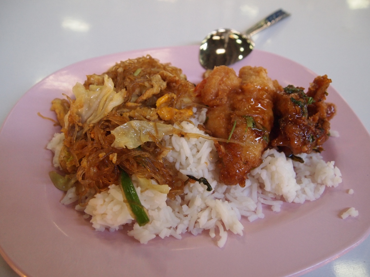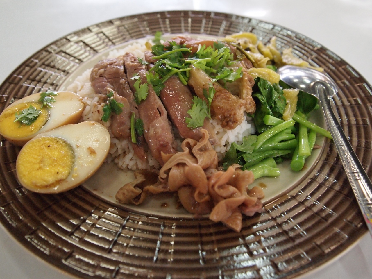 サラデーンからシーロム通りを7分ほど歩くと右手に市場があります。奥には食事のできるお店がたくさんあり、概ねどこも衛生的でおいしかったです。昼休みには周辺のサラリーマンが大勢やってきて食事をとるので、少し時間をずらしたほうがいいでしょう。カーカームー好きな私は、毎回一度はここで食べてます。カオカームーは40バーツ、エストコーラ(タイ限定コーラ?)10バーツでした。