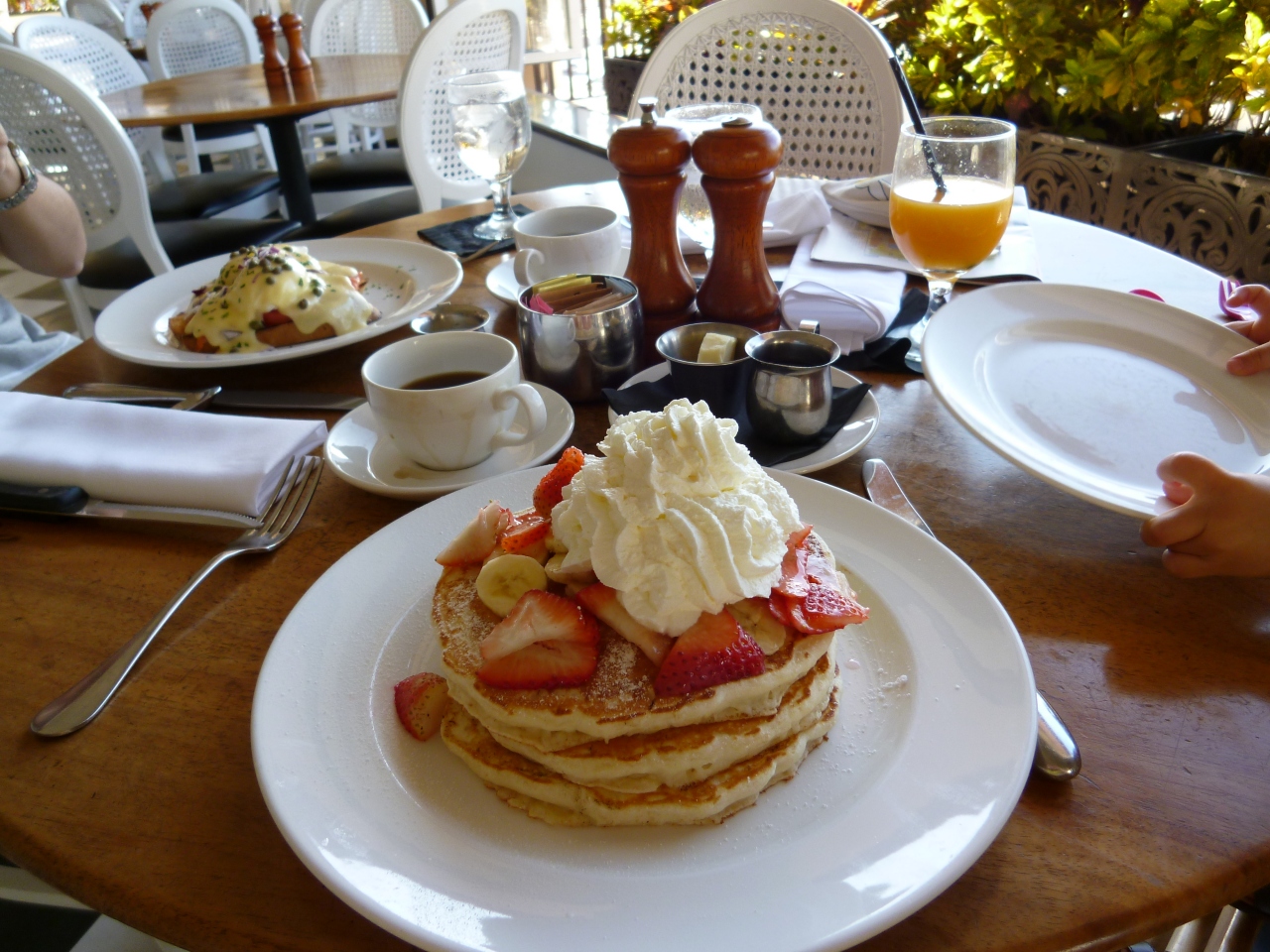 ハワイに来たらパンケーキを食べようと思っていて、人気店すぎて並ぶのも、日本人ばかりなのも嫌だし、でもフルーツたっぷりの綺麗で美味しいものがいいし、スケジュールもあるし・・・と、いろいろ考えた結果、アラモアナSCでのショッピングタイムの前にのんびり食事をしようと、ここになりました。アラモアナSCのオープン前から空いているので時間の有効活用できます。