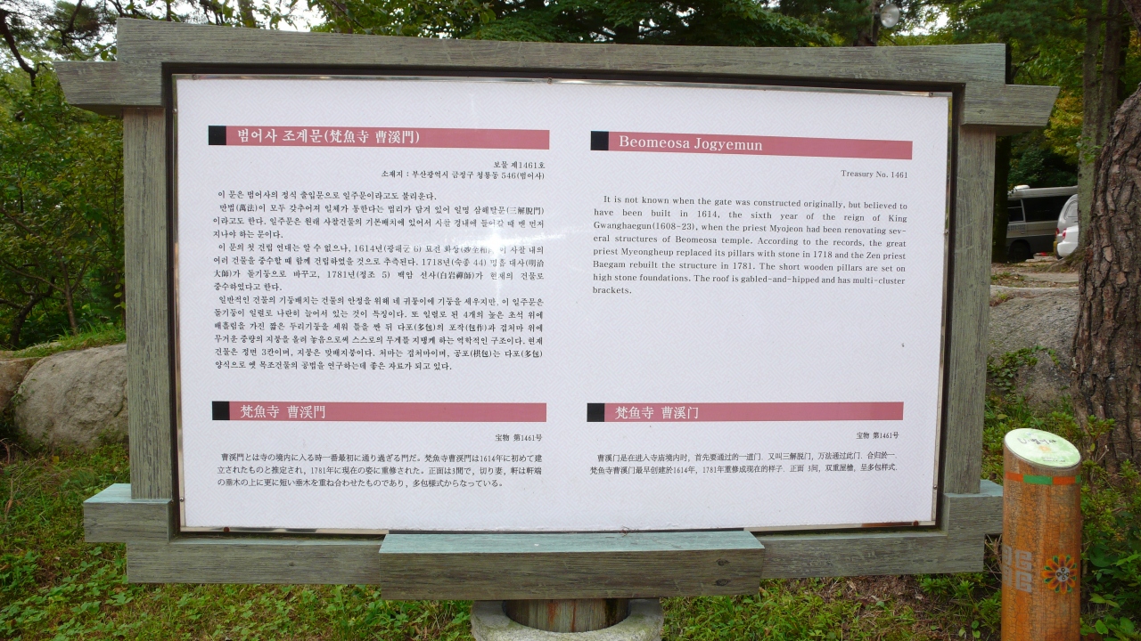 金井山の麓にある静かな山寺。韓国ムードたっぷりでお勧めかも。創建は新羅時代だというが、当時のものは境内に残る石塔のみ。本堂は国宝に指定され、極彩色の柱などもなるべく原型のまま保存されている。ひなびた感じが味わい深く、新緑や紅葉の時期は特に美しい。韓の国三十三観音聖地第二十五番。