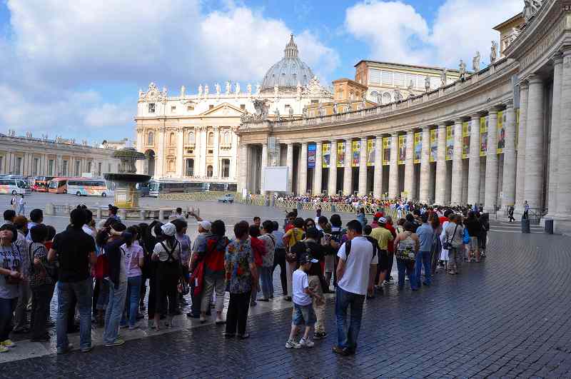ローマ市内にあって、地下鉄で行ける独立国のバチカン市国。その中心にある広場とあって、かなり広い。その広いところに長い列ができていた。大聖堂に入る観光客らだ。込むと聞いていたので、朝早い時間に行ったのだが、それでも列は長くなっていた。さすがサン・ピエトロ広場だ。