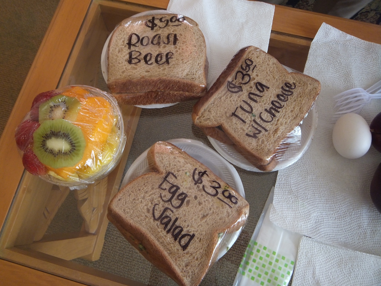 ってことでカットフルーツのMIX4(パイン・パパイヤ・キュウイ・いちご)を買ってみた。そしてちょうどお昼時だったのでサンドイッチも買った。