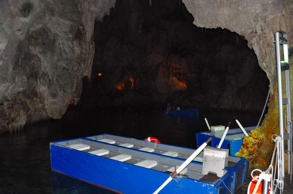アマルフィの港から小船で行った。所要30分弱でエメラルドの洞窟の入り口に着き、小さな船着き場で降りると、目の前に洞窟の入り口がある。中で渡し船のような小舟に乗ると、船頭が水面を回り、説明する。青い色合いがきれいな場所もあったが、青の洞窟よりずっと小規模な青色。水深10メートルという水中にマリア像やキリスト像が置かれているというが、滞在時間が短くて、よく見えなかった。その「神秘性」を売り物にしているのかも。洞窟へ往復する間、アマルフィの崖や海岸の様子がよくわかるので、これもよかった。