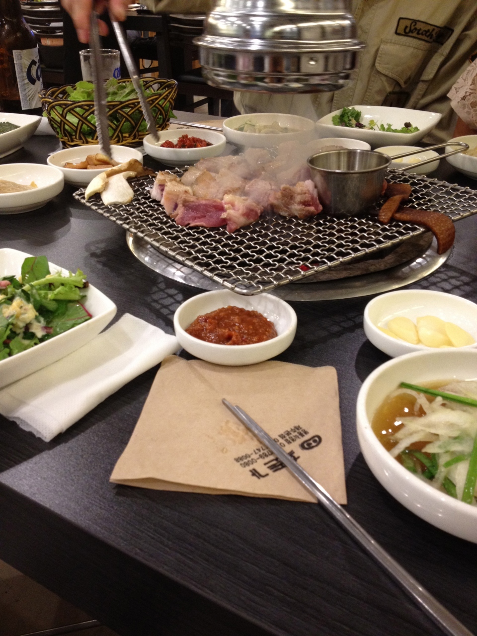 かなり席数のある広い店です。五段豚ばら肉を頼むと大きな分厚い肉が運ばれますが、店の人が焼いて適当に小さく切ってくれます。それをメルジョというたれにつけ、野菜に包んで食べるようになっていました。熟成させたメルジョがこの店の売りのようですが、特にこれをつけるとおいしくなるとは思いませんでした。それよりタマネギのスライスの酸っぱいたれのほうが、さっぱりして私には合いました。冷麺もとてもさっぱりしています。