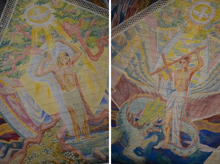 1697年創建のノルウェー国教ルーテル派の総本山ということなんですが、天井画は1900年代半ばに描かれたようで、随分新しいスタイルの絵柄と色使いに驚き。