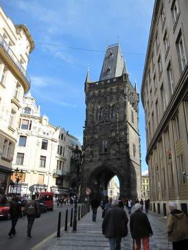 プラハ城を見学しカレル橋~旧市庁舎広場へ向かい広場一帯にある聖ミクラーシュ教会、テイーン教会などを見てティーン教会の横の道ツェレトゥナー通りの石畳を歩いてしばらくすると火薬塔が見えてきました。塔の下に近づきますと以外に大きく感じました。