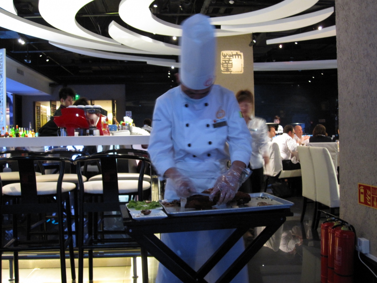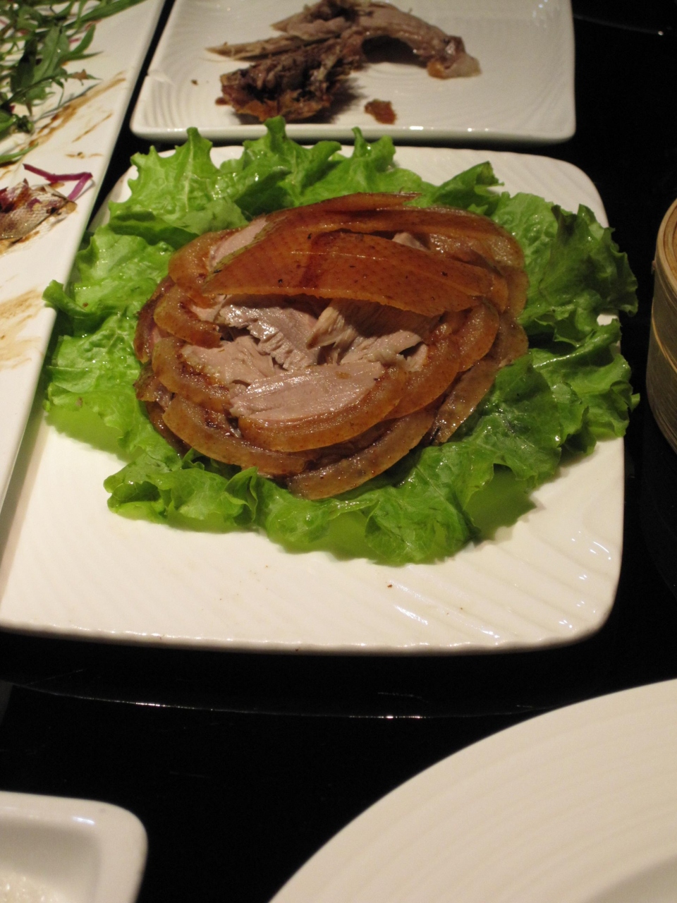 でもメニュー的にはおしゃれなものもありますが、やはりメインは北京ダック。友人と2人だったので、半羽サイズを注文し、前菜2−3品と飲み物を注文しました。シェフが真横でダックをスライスしてくれ、皿に盛られたら早速、餅にネギ、キュウリ、醤をくるんでパクつきました。駐在時は全◯徳に良く行っていましたが、比較するとアッサリした感じで食も進みます。前菜がボリュームがあったので、半羽でも少し残しましたがお腹も膨れて満足しました。