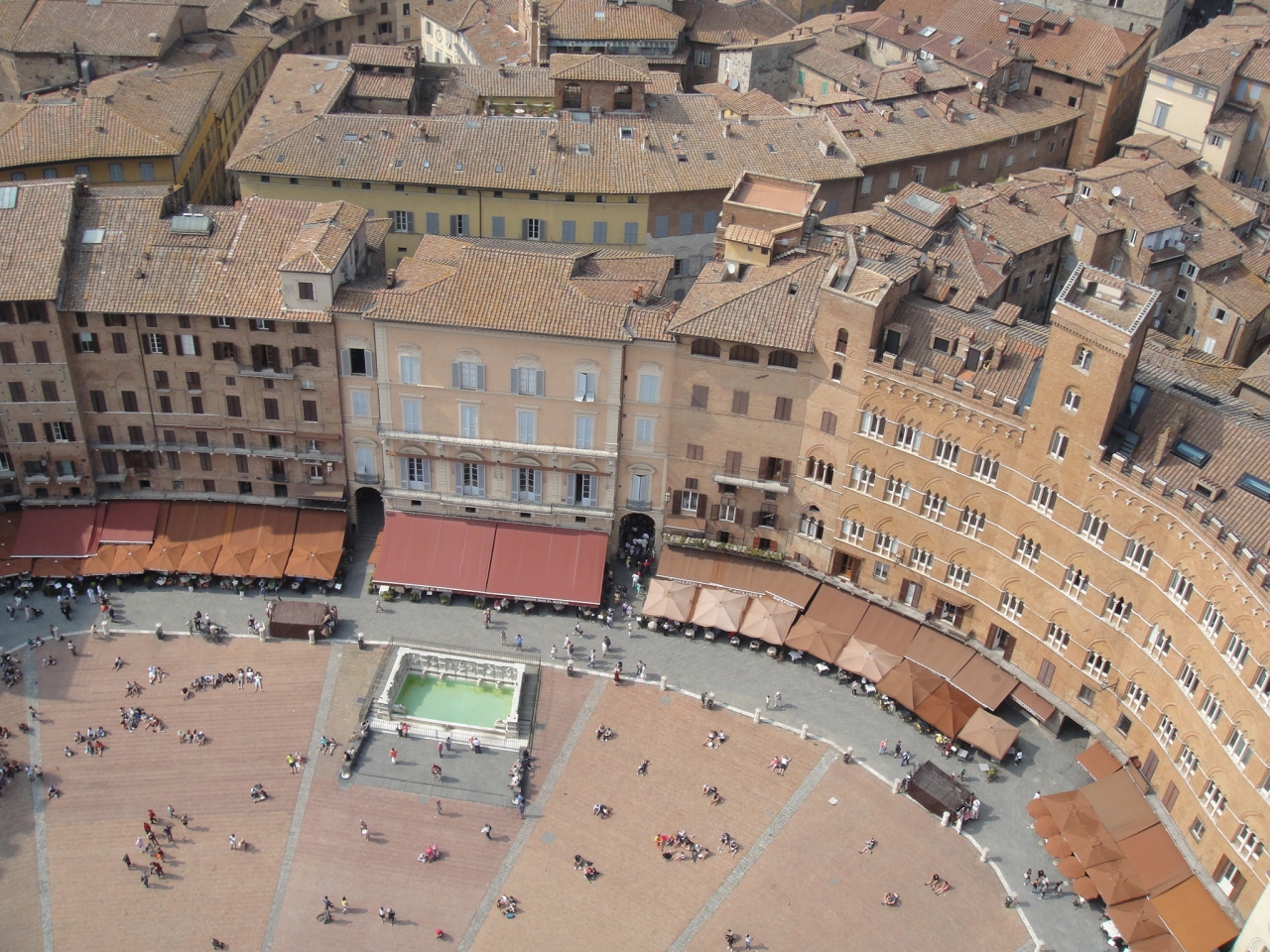 入口は中庭部分にあります。25人ずつの人数制限になっていますが、タイミングがよければそれほど待たずに入ることができます。途中まで上がったところで手荷物をロッカーに預けて、階段を上ります。約500段ありますが、上った先では絶景が見られます。真下にはカンポ広場、そして茶色い屋根の家々と、その先に広がる丘陵地帯の風景はすばらしかったです。