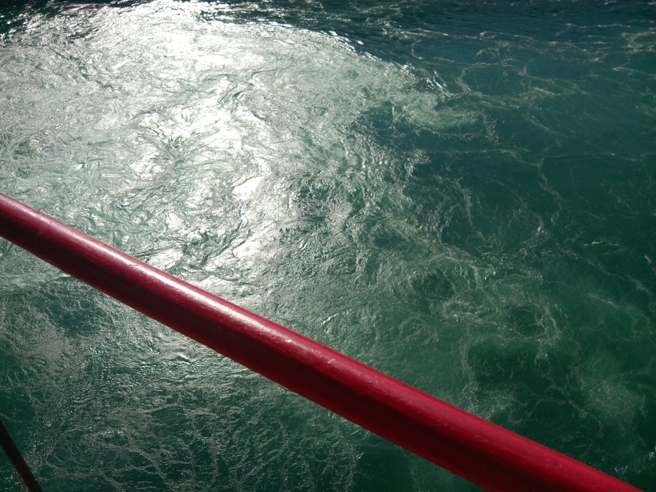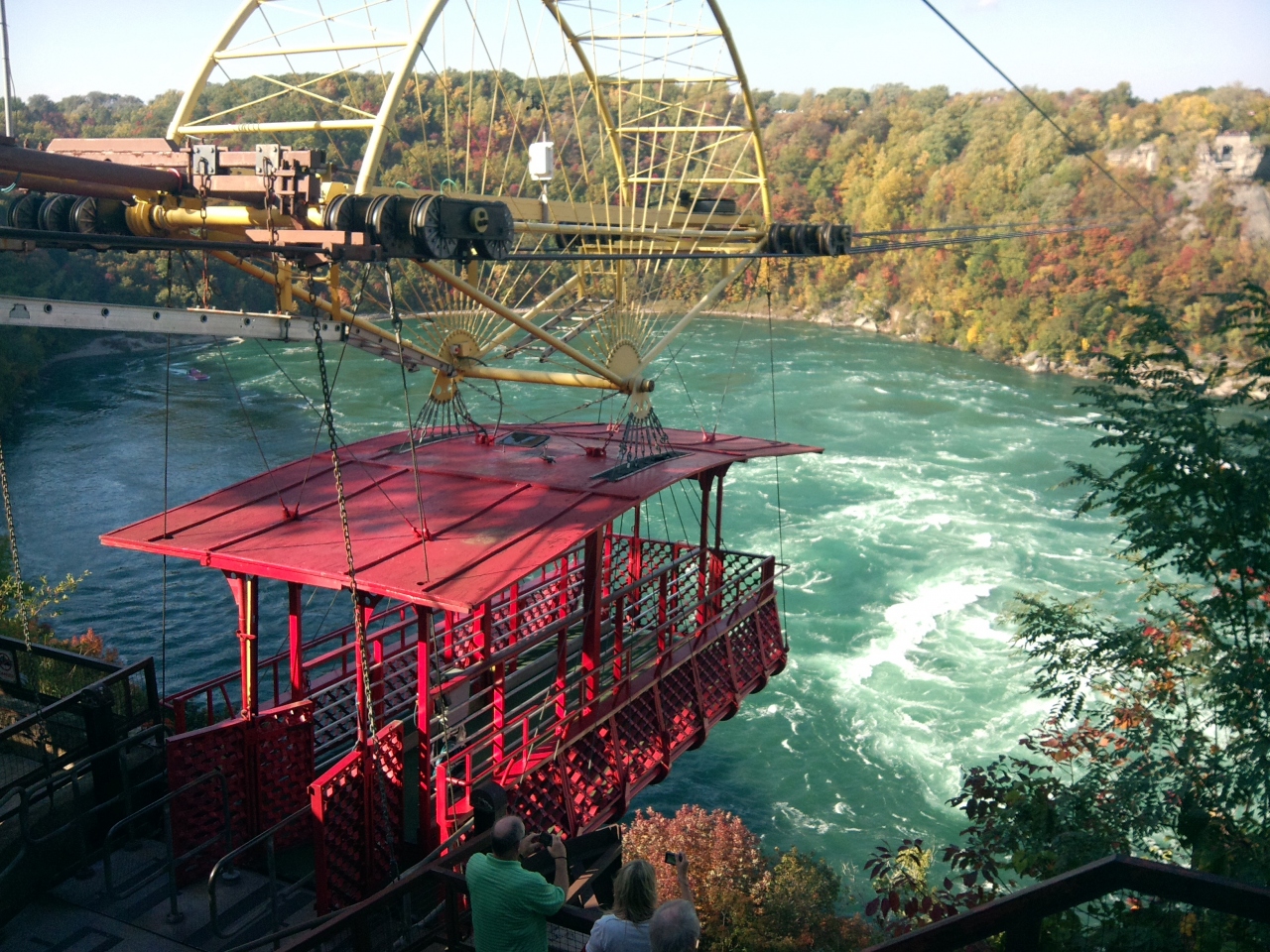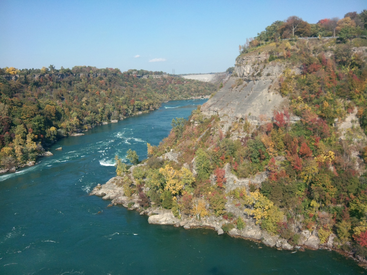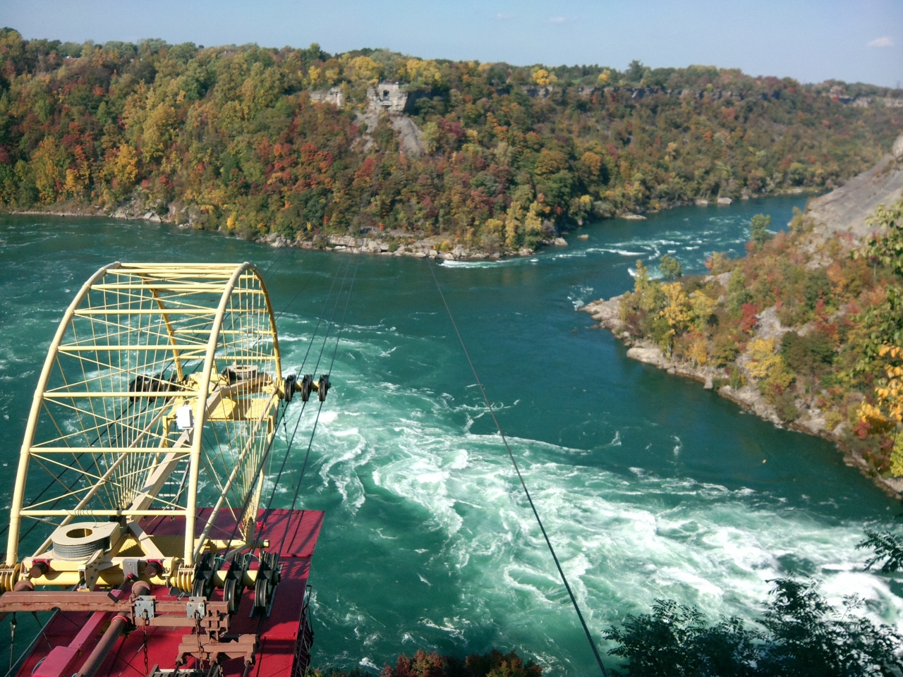 アメリカ滝・カナダ滝からバスに揺られて十数分。このあたりでは急流も緩やかになり、川の流れも大きく変わります。その真上をゴンドラに乗ってゆっくりと眺めます。ちょっと足元がすくみますが、絶景です。紅葉の季節ならもっときれいでしょうね。