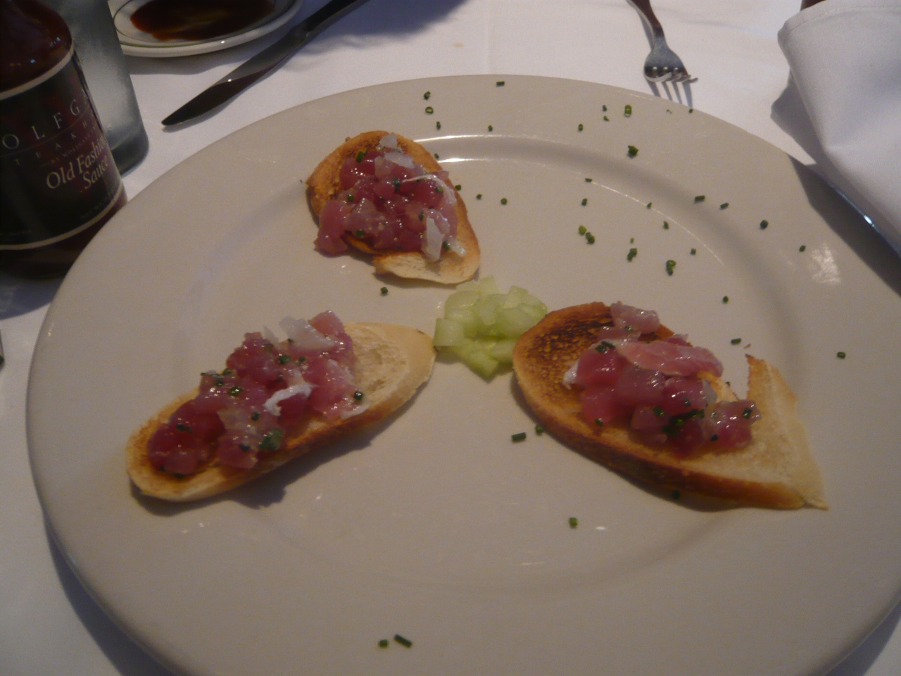ルースズクリスと迷いましたが、今回はこちらを初めて利用しました。18時半までのハッピーアワーと伝えるとカウンター席を案内されます。注文はターター、ステーキ、ハンバーガーにしました。おすすめはステーキ(テイストオブニューヨーク)とハンバーガー(カルビバーガー)です。またハッピーアワーで利用します!