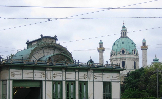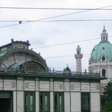 ウィーンの楽友協会やカールス教会の最寄駅がカールスプラッツ駅。この駅はウィーンの有名な建築家、オットーワーグナーの作品。オットーワーグナーの世紀末建築はウィーンに多いがその代表作のひとつ。金色の装飾がワーグナーの特徴。写真の背景はカールス教会。