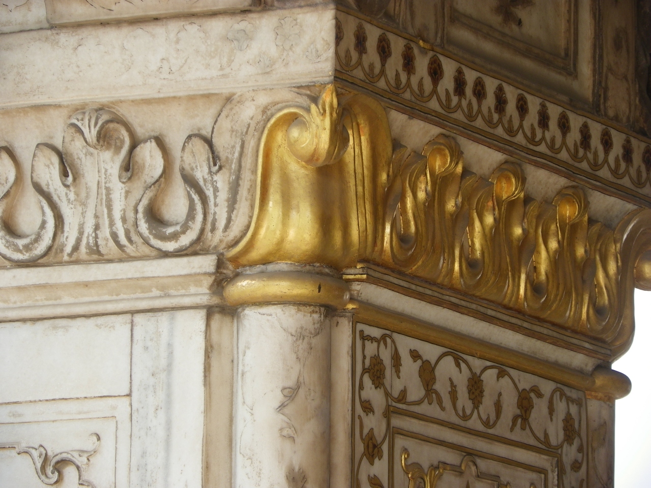 イギリスはインドの植民地経営から莫大な富を得ていました。このため、インドは金の卵を産む鶏と呼ばれていました。セポイの反乱が起きるとイギリス人も植民地経営に協力したインド人も我先にインドから逃げ出しました。その時に何をしたのか?鶏を殺して金を持って逃げたのです。写真はそのときの証拠です。逃げる時に、人々は部屋の装飾の金銀宝石を剥がして、イギリスへ持ち出したのでした。あまりに慌てたせいか、少しだけ剥がし忘れた金の装飾が残っています。