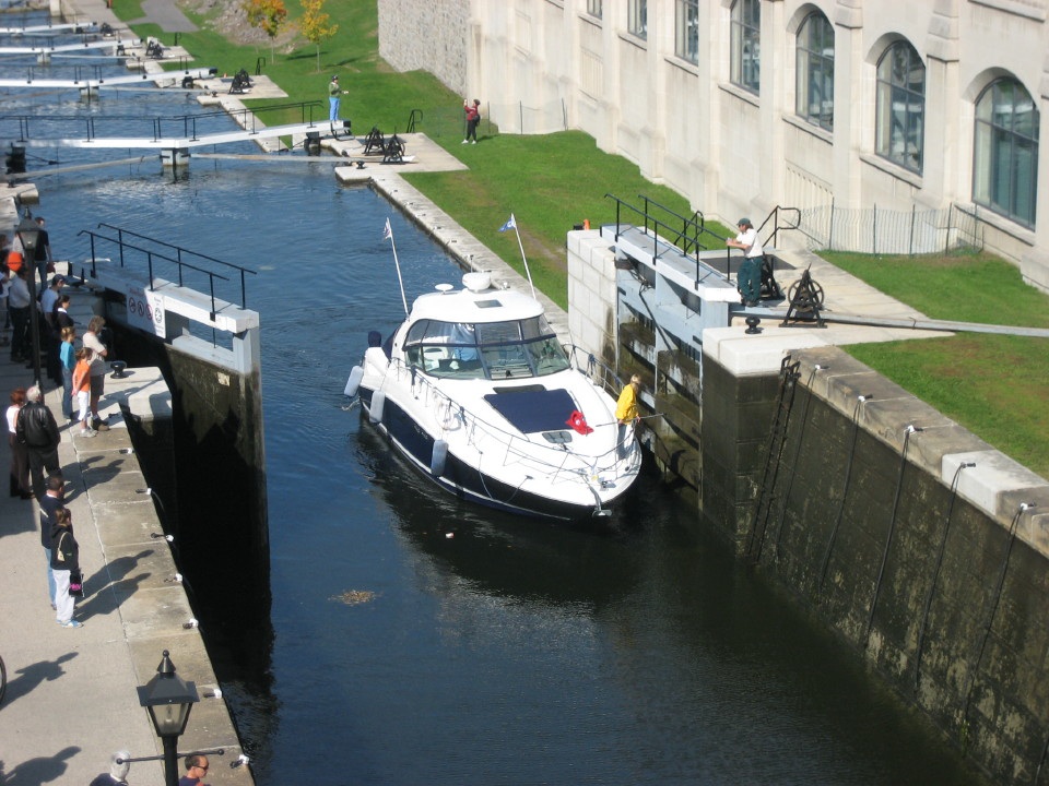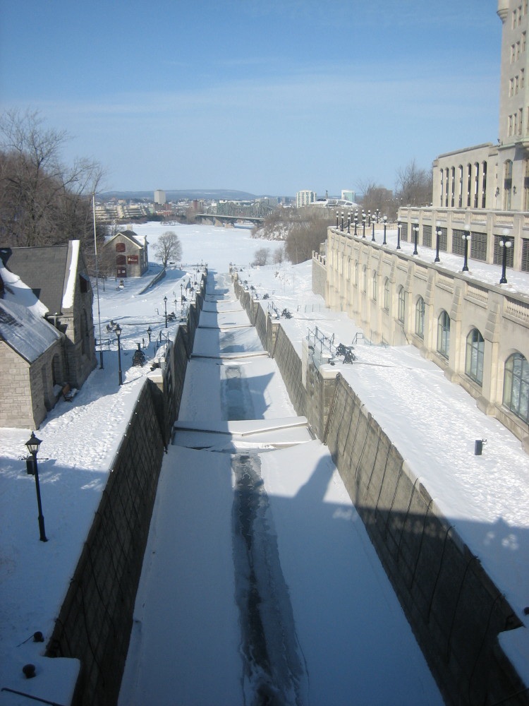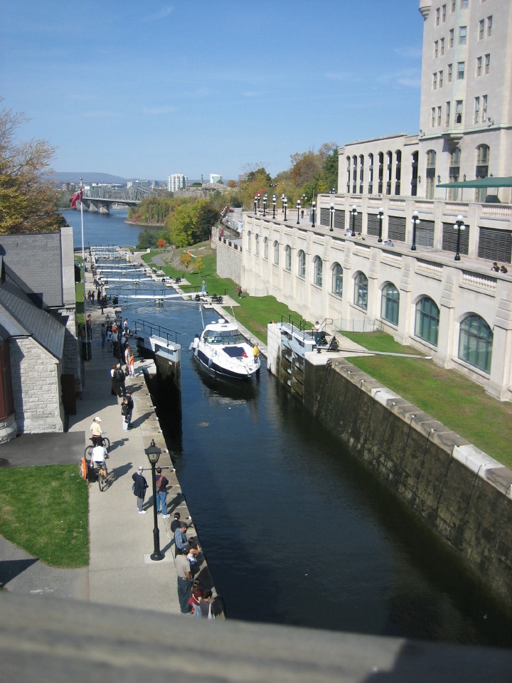 ここオタワからキングストンまで200km超の距離のあるリドー運河のオタワ側の始点がパーラメントヒル(国会議事堂)とホテルシャトーローリエの間にあります。