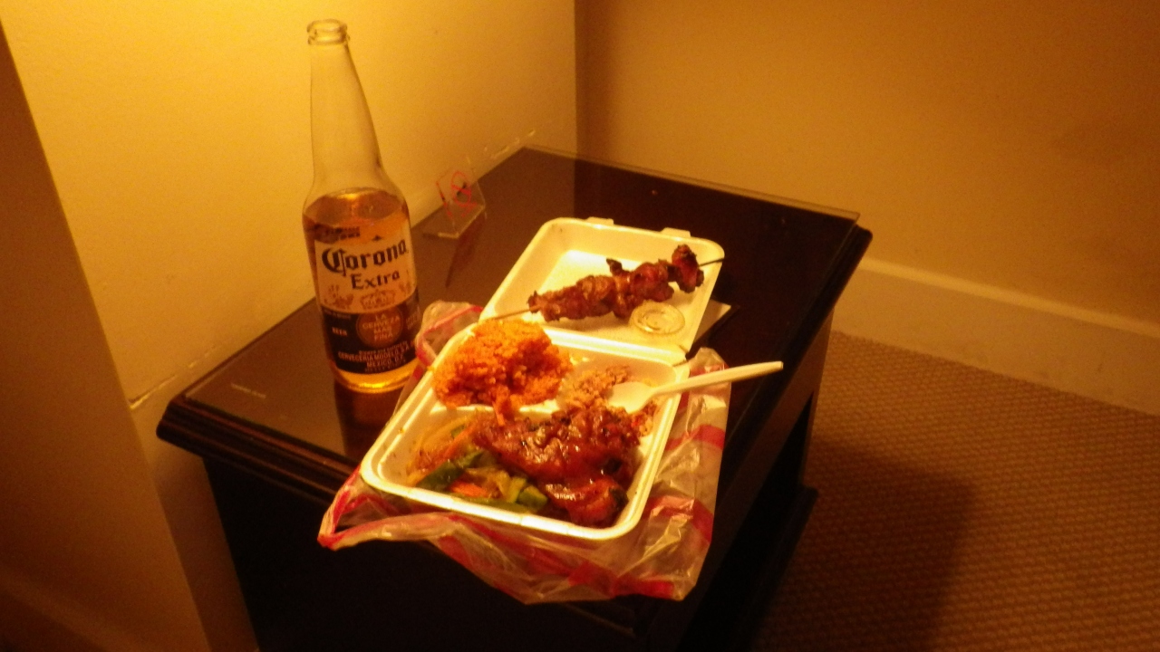 人がたくさん並んでいる屋台でBBQプレートを買って混雑を避けるためにテイクアウトして早めにホテルに帰った。