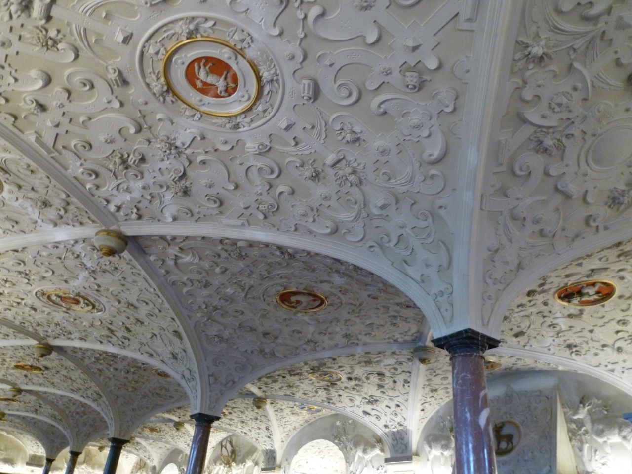 「バラの部屋」とよばれる部屋の天井には一面の彫刻がほどこされており、その造形とも相まって見応え十分です。