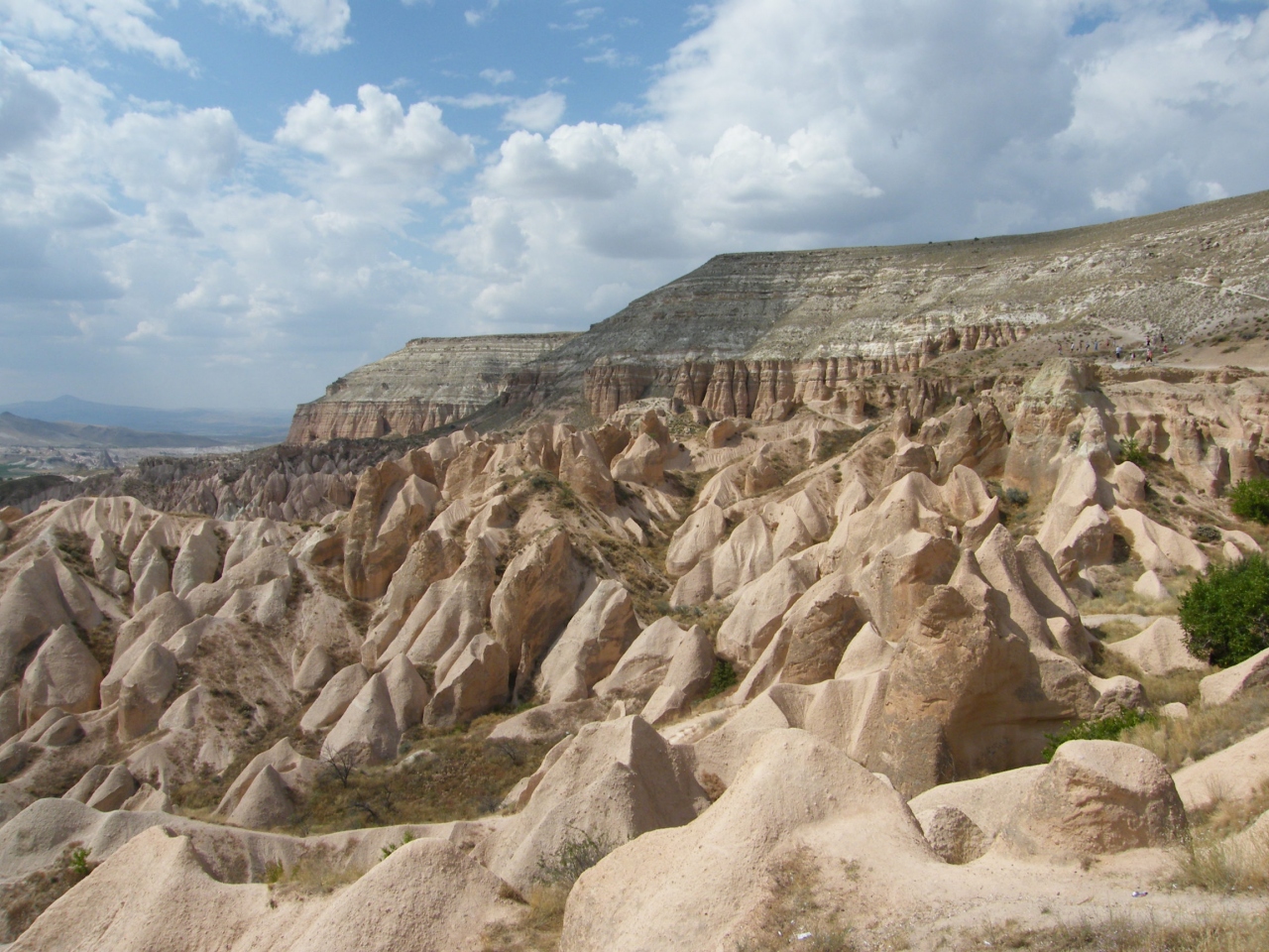 ギョレメからウチヒサルに向かう道の途中に狭い駐車スペースがあります。ここからギョレメの谷を一望できます。地層による色のコントラストも美しいですが、広い谷間を一望でき、その雄大さには言葉を失います。