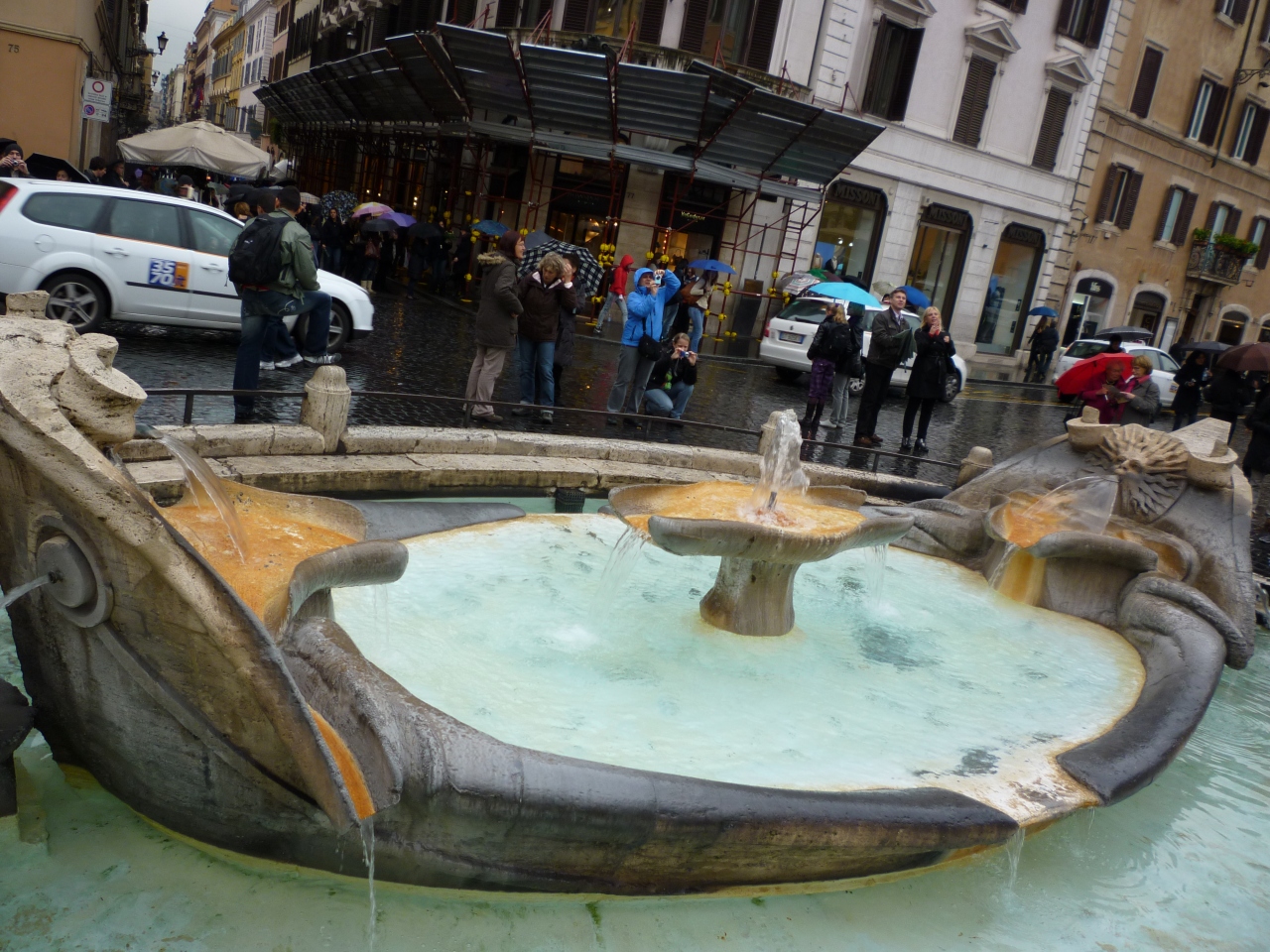 スペイン広場の階段を降りたところにある小船型の小さな噴水です。